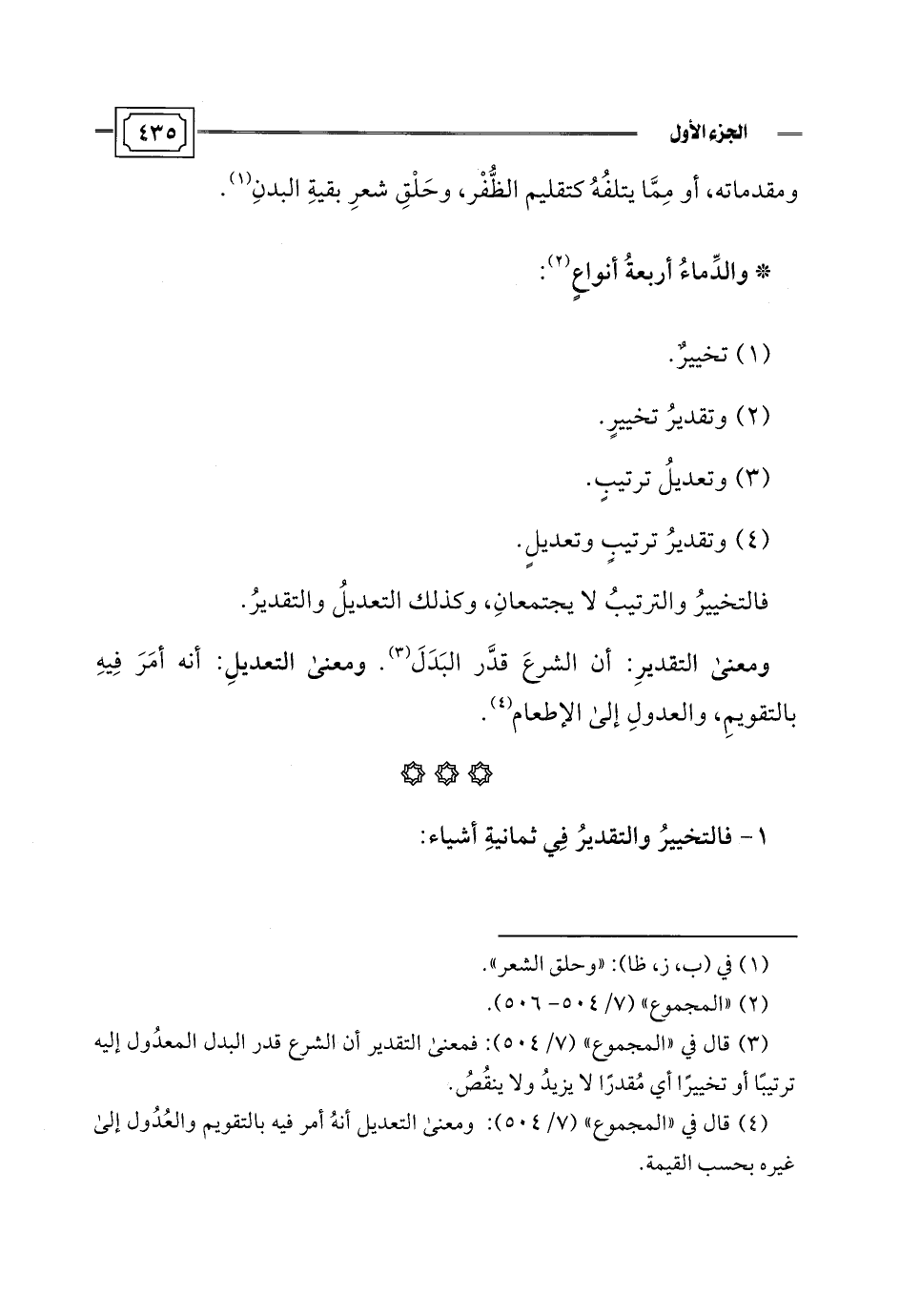 (¬3) قال في "المجموع" (7/ 504): فمعنى التقدير أن الشرع قدر البدل المعدُول إليه ترتيبًا أو تخييرًا أي مُقدرًا لا يزيدُ ولا ينقُصُ.