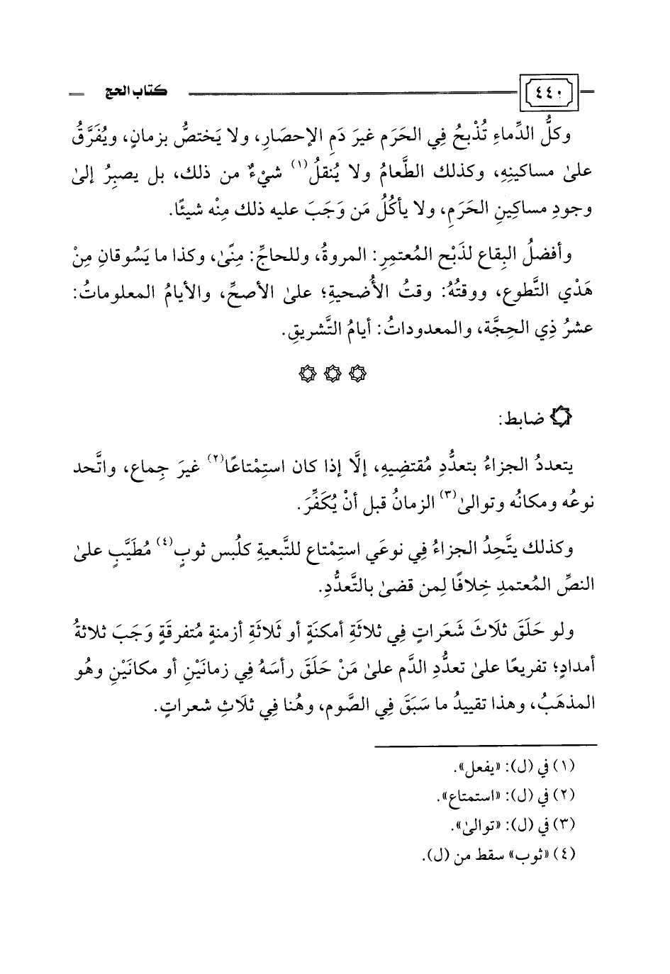 وأفضلُ البِقاع لذَبْح المُعتمِرِ: المروةُ، وللحاجِّ: مِنًى، وكذا ما يَسُوقانِ مِنْ هَدْي التَّطوع، ووقتُهُ: وقتُ الأُضحيةِ؛ على الأصحِّ، والأيامُ المعلوماتُ: عشرُ ذِي الحِجَّة، والمعدوداتُ: أيامُ التَّشريقِ.