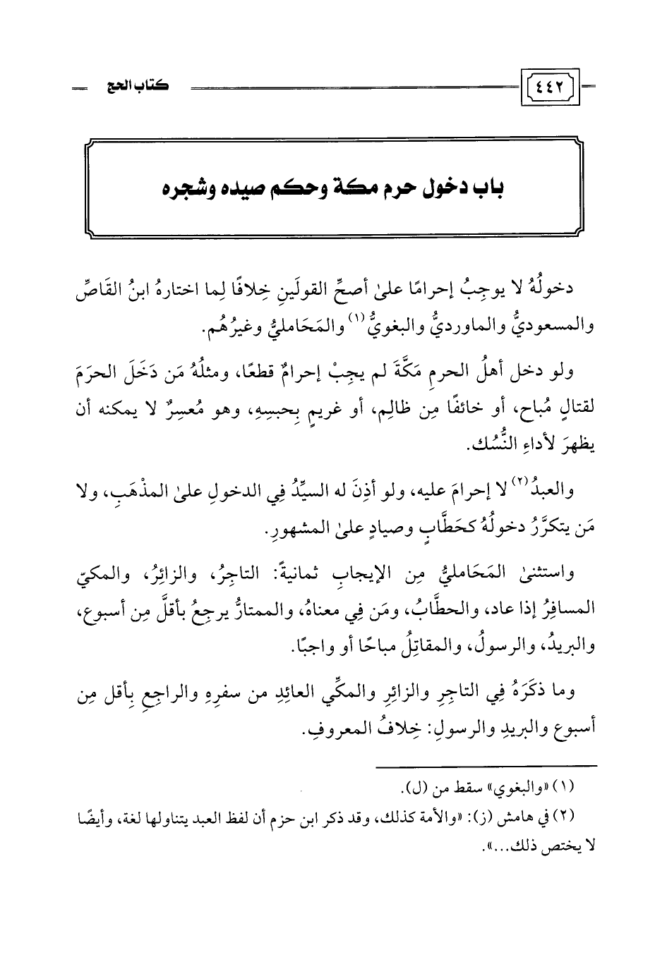 دخولُهُ لا يوجِبُ إحرامًا على أصحِّ القولَينِ خِلافًا لِما اختارهُ ابنُ القَاصِّ والمسعوديُّ والماورديُّ والبغويُّ (¬1) والمَحَامليُّ وغيرُهُم.