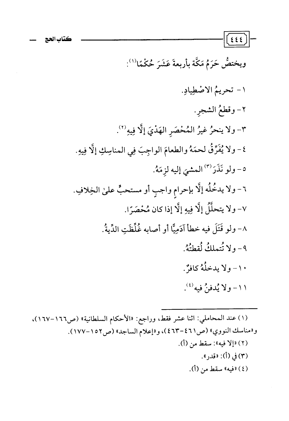 (¬1) عند المحاملي: اثنا عشر فقط، وراجع: "الأحكام السلطانية" (ص 166 - 167)، و"مناسك النووي" (ص 461 - 463)، و"إعلام الساجد" (ص 152 - 177).