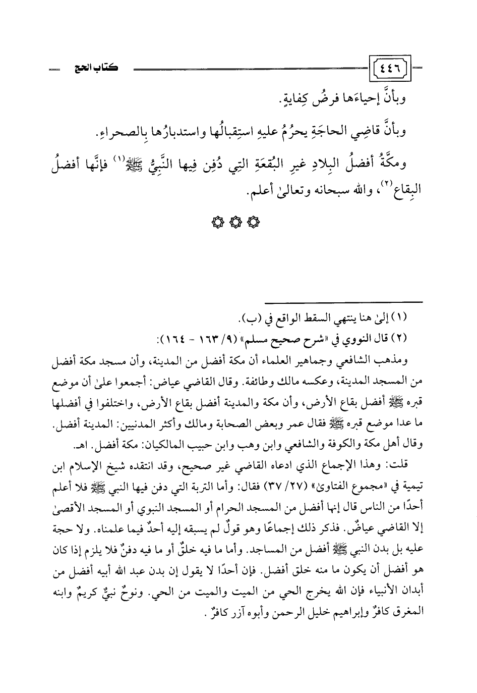 ومكَّةُ أفضلُ البِلادِ غيرِ البُقعَةِ التِي دُفِن فِيها النَّبِيِّ -صلى اللَّه عليه وسلم- (¬1) فإنَّها أفضلُ البِقاع (¬2)، واللَّه سبحانه وتعالى أعلم.