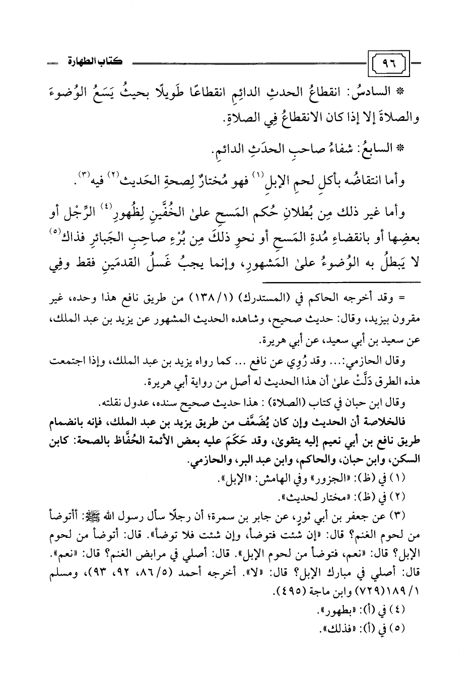 (¬3) عن جعفر بن أبي ثورٍ، عن جابر بن سمرة؛ أن رجلًا سأل رسول اللَّه -صلى اللَّه عليه وسلم-: أأتوضأ من لحوم الغنم؟ قال: "إن شئت فتوضأ، وإن شئت فلا توضأ". قال: أتوضأ من لحوم الإبل؟ قال: "نعم، فتوضأ من لحوم الإبل". قال: أصلي في مرابض الغنم؟ قال: "نعم". قال: أصلي في مبارك الإبل؟ قال: "لا". أخرجه أحمد (5/ 86، 92، 93)، ومسلم 1/ 189 (729) وابن ماجة (495).
