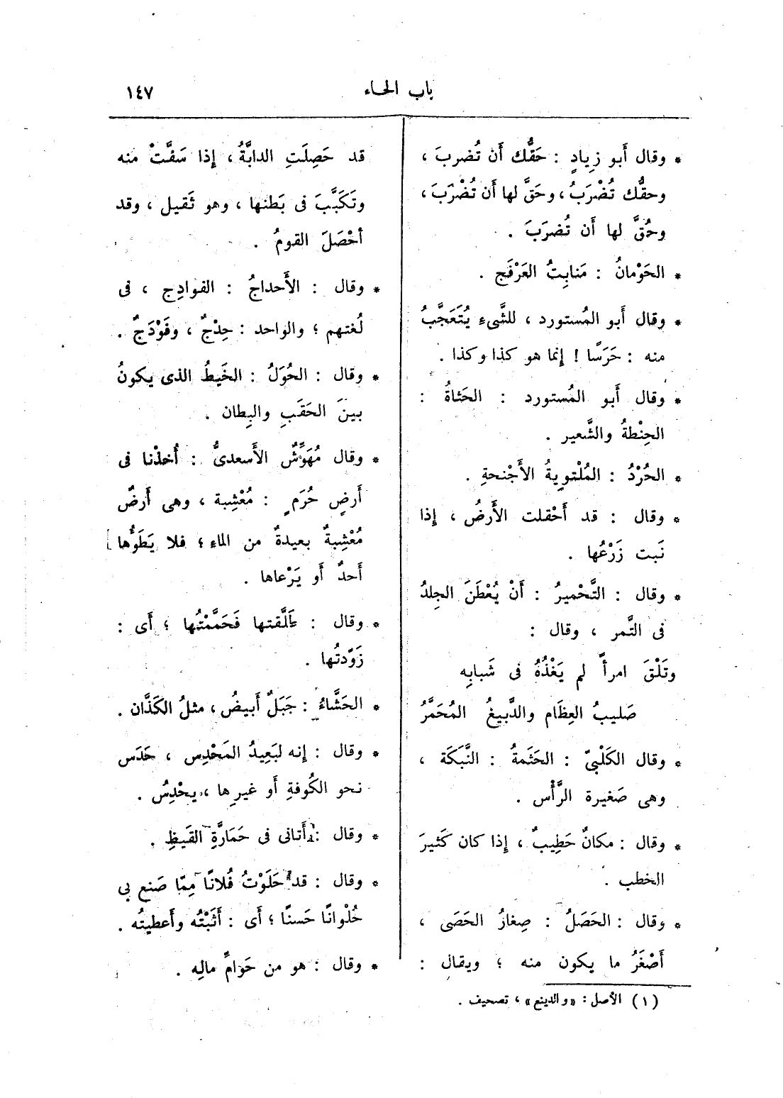 وقال: الحَصَلُ: صغار الحصى، أصغر ما يكون منه؛ ويقال: قد حَصِلَتِ الدابة، إذا سفَّت منه وتكبب في بطنها، وهو ثقيل، وقد أحصل القوم.