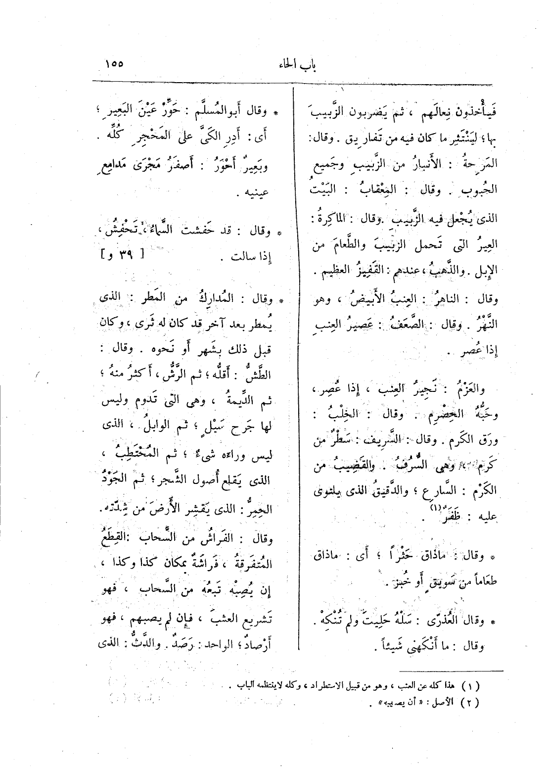 فيأخذون نعالهم، ثم يضربون الزبيب بها؛ لينتشر ما كان فيه من تفاريق. وقال: المَرِحةُ: الأنبار من الزبيب وجميع الحبوب. وقال: المِعْقابُ: البيت الذي يُجعل فيه الزبيب. وقال: الماكرة: العِير التي تحمل الزبيب والطعام من الإبل. والذَّهبُ، عندهم: القفيز العظيم.