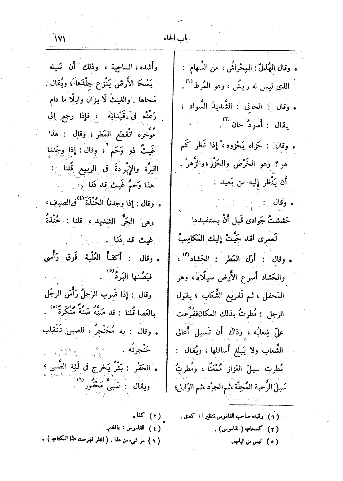 وقال: أول المطر: الحشاد، والحشاد أسرع الأرض سيلاً، وهو المحفل، ثم تفريع الشِّعَاب؛ يقول الرجل: مُطرتُ بذلك المكان ففرِّعت عليّ شعابه، وذاك أن تسيل أعالي الشِّعاب ولا يبلغ أسافلها؛ ويقال: مطرت سيل العزاز ممعناً، ومطرت سيل الرَّحبة المُحلة، ثم الجود، ثم الوابل؛ وأشده الساحية، وذلك أن سيله يسحا الأرض ينزع جلدها؛ ويقال: سحاها. والغيث لا يزال وابلاً ما دام رعده في قيدايه، فإذا رجع إلى مؤخره انقطع المطر؛ وقال: هذا غيث ذو وحم؛ وقال: إذا وجدنا القرة والإبردة في الربيع قلنا: هذا وحم غيث قد دنا.