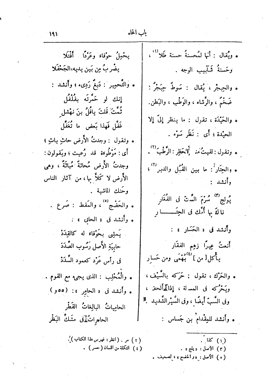 وتقول: وجدت الأرض حاث باث؛ أي: موطوءة قد رُعيت؛ ويقولون: وجدت الأرض محاثة مباثة، وهي الأرض لا كلأ بها، من آثار الناس وحنك الماشية.