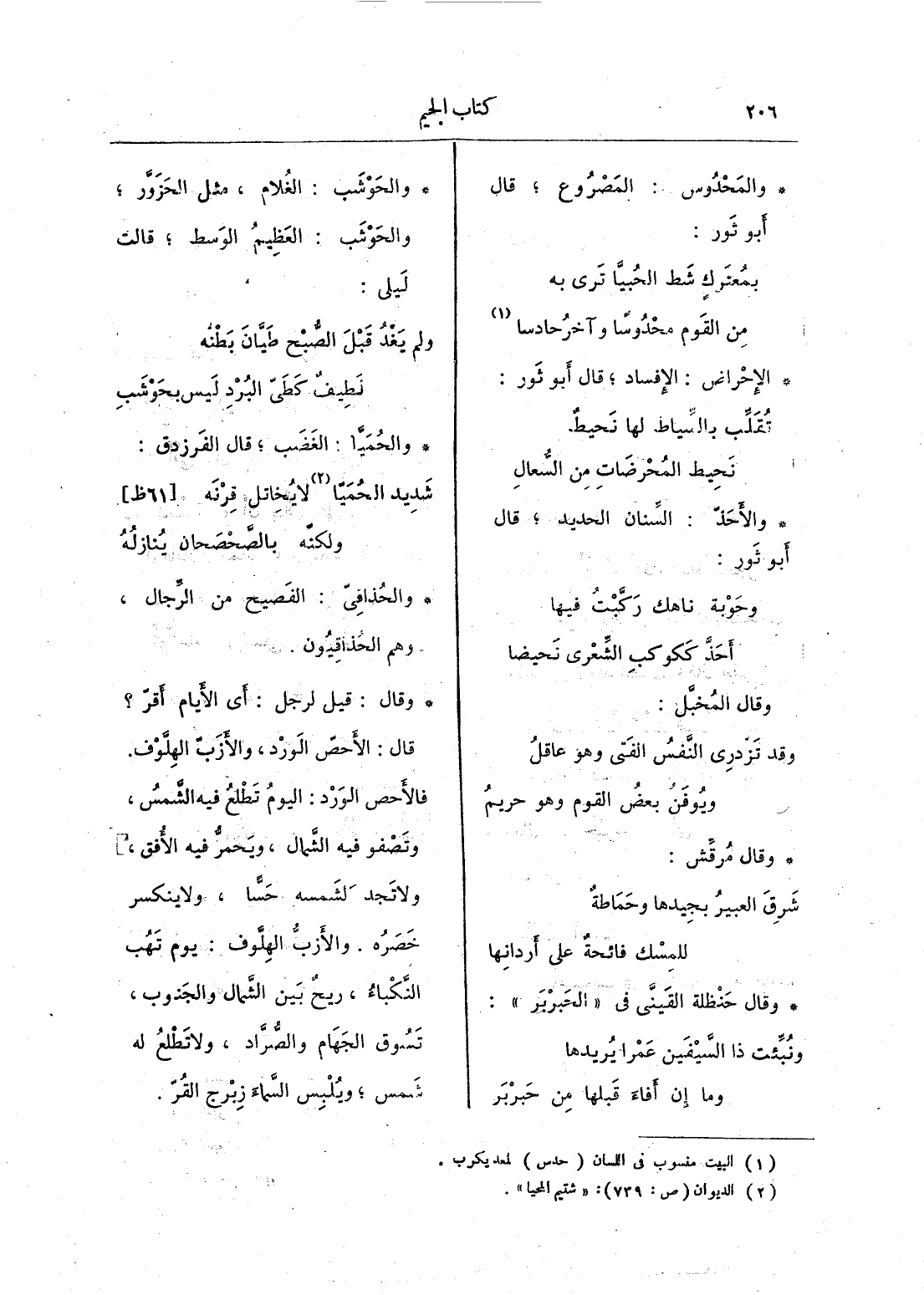 فلأحص الورد: اليوم تطلع فيه الشمس، وتصفو فيه الشمال، ويحمر فيه الأفق، ولا تجد لشمسه حسا، ولا ينكسر خصره. والأزب الهلوف: يوم تهب النكباء، ريح بين الشمال والجنوب، تسوق الجهاد والصراد، ولا تطلع له شمس؛ ويلبس؛ ويلبس السماء زبرج القر.