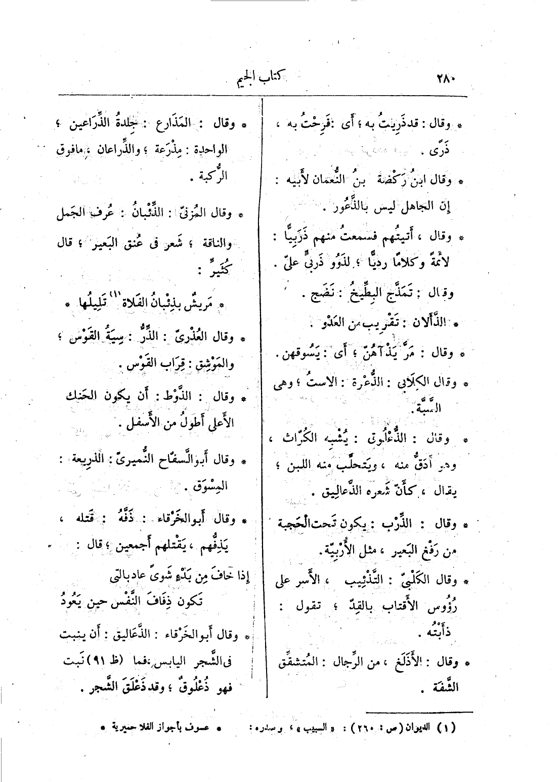 وقال المزنىّ: الذئبانُ: عرف الجمل والناقة؛ شعر في عنق البعير؛ قال كثيرِّ: