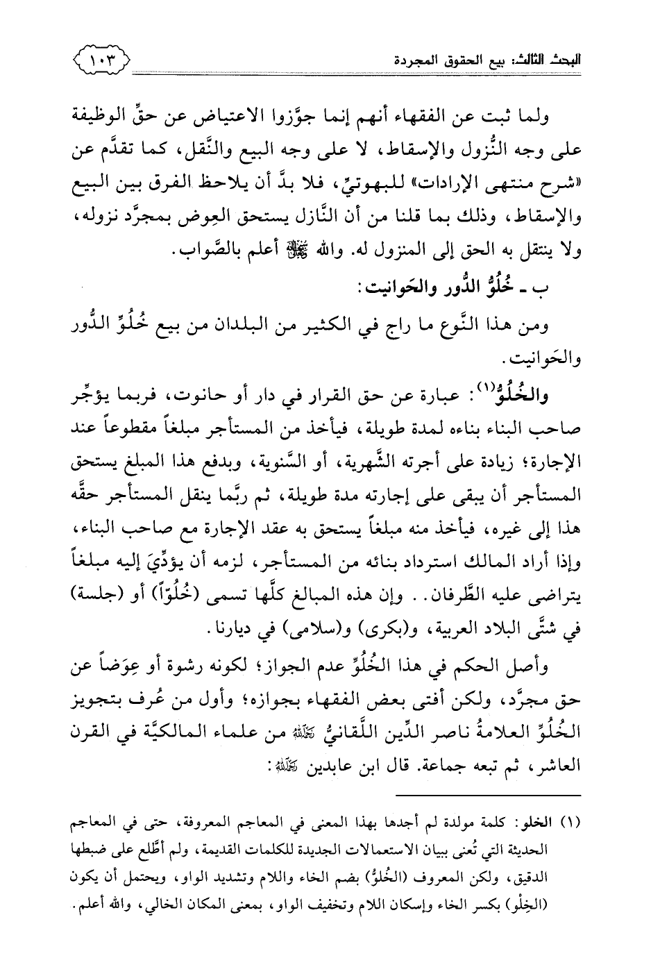 والنوع الثالث من هذه الحقوق ما نستطيع أن نسميه " بحق العقد " ونقصد بذلك حق إنشاء عقد مع آخر أو إبقائه، مثل خلو الدور والحوانيت، فإنه حق لإنشاء عقد الإجارة مع صاحب الدار أو الحانوت أو إبقائه، ومثل حق الوظائف السلطانية أو الوقفية، فإنه حق لإبقاء عقد الإجارة مع الحكومة أو ناظر الوقف. وقد تحدث الفقهاء عن مسألة الاعتياض عن هذين الحقين، ونذكر فيما يلي خلاصة ما قاله الفقهاء في هذا الباب، والله سبحانه هو الموفق.
