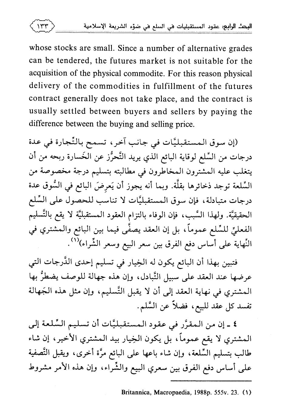 وليس الأمر حقيقة بهذه البساطة التي تبدو مما ذكرنا من طريق هذا التعامل، ولا يقع أبدا أن ينتظر المشتري تاريخ التسليم ويتسلم السلعة المبيعة عندئذ، وإنما يظل هذا العقد فيما بين شهر يناير وشهر أكتوبر محل بيع وشراء في كل يوم، وربما يقع على العقد الواحد عشرات البياعات يوميا، إلى أن يأتي الأجل، فلو باع زيد مثلا إلى عمرو وحدة من القمح لتسليم شهر أكتوبر، فإن عمرا يبيعه بعد ذلك إلى خالد، وخالد إلى حامد، كل واحد منهم بثمن ربما يختلف عن الثمن الأول، والفارق بين