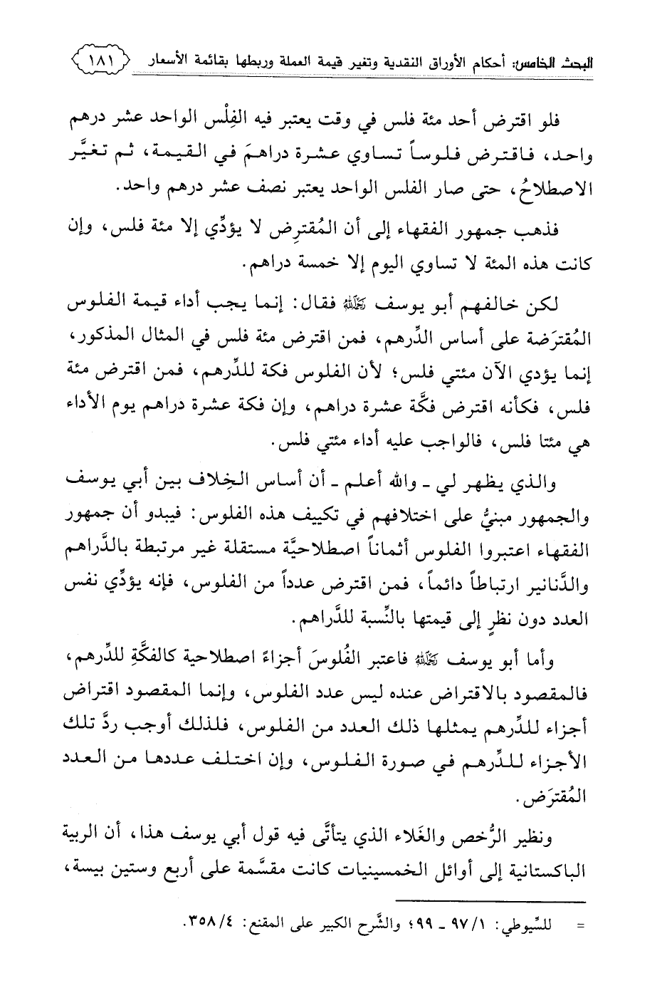 بها ذاتها، فإنها بذاتها لا تسد جوعا، ولا تستر جسما، ولا تدفع شهوة، ولا ترد ضررا. وإنما المقصود من هذه النقود أن يشتري بها المرء ما يحتاج إليه في حياته من بضائع وخدمات. فمن هذه الجهة كل نقد له قيمتان: الأولى قيمتها الاسمية (Price Value) ، وهي المكتوبة عليها، والثانية: قيمتها الحقيقية (Real Value) ، وهي الفائدة العملية الحقيقية التي يحصل عليها المرء بصرفها في حاجاته، وبعبارة أخرى: هي مجموعة من البضائع والخدمات التي يمكن للمرء أن يشتريها بتلك النقود. وإن هذه المجموعة من البضائع يسميها الاقتصاديون اليوم " سلة البضائع " (basket of goods) ، فالقيمة الحقيقية للنقود هي سلة البضائع الممكن شراؤها بها.