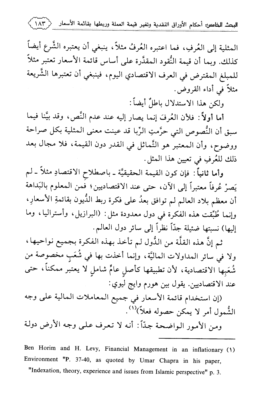 فتقرر بهذا المثال أن سلة البضائع قد ارتفعت قيمتها فيما بين سنة 1980 م - و 1987 م بنسبة اثنين فاصل خمسة في المائة حسب المعدل الموزون الذي أخذ أهمية كل بضاعة بعين الاعتبار. وبما أن سلة البضائع هي القيمة الحقيقية للنقود، فإن قيمتها الحقيقية قد انتقصت بقدر 2.5 % ومعنى ذلك أن السلعة التي يشتريها الرجل في سنة 1980 م بمائة ربية، صارت تشترى في سنة 1987 م بمائتين وخمسين ربية.