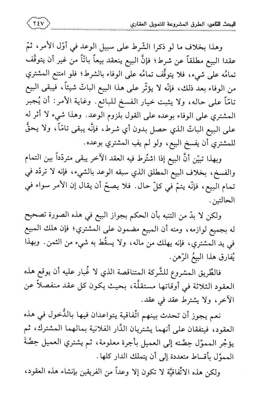 أما إذا كان المقصود بناء البيت على أرض خالية، فيمكن استخدام نفس الطريق في شراء الأرض, بأن يقع شراؤها على سبيل الاشتراك من الممول والعميل، ثم يبيع الممول حصته في الأرض إلى العميل مؤجلا بثمن أكثر. فإن كانت الأرض مملوكة للعميل، أو صارت ملكا له بهذا الطريق وأراد العميل التمويل للبناء عليها، فإنه يمكن للممول والعميل أن يبنيا البيت على أساس المشاركة، فيدفع هذا نصف نفقة البناء، ويدفع ذلك النصف الآخر، فيقع البناء مشاعا بينهما بالنصف، وحينما يتم البناء يمكن للممول أن يبيع حصته من البناء إلى شريكة العميل مؤجلا بربح، وبيع الرجل حصته من البناء إلى شريكه مما لا نزاع في جوازه، وإن كان هناك خلاف في بيعها إلى الأجنبي، يقول ابن عابدين في رد المحتار: (ولو باع أحد الشريكين في البناء حصته لأجنبي، لا يجوز، ولشريكه جاز) (1) .
