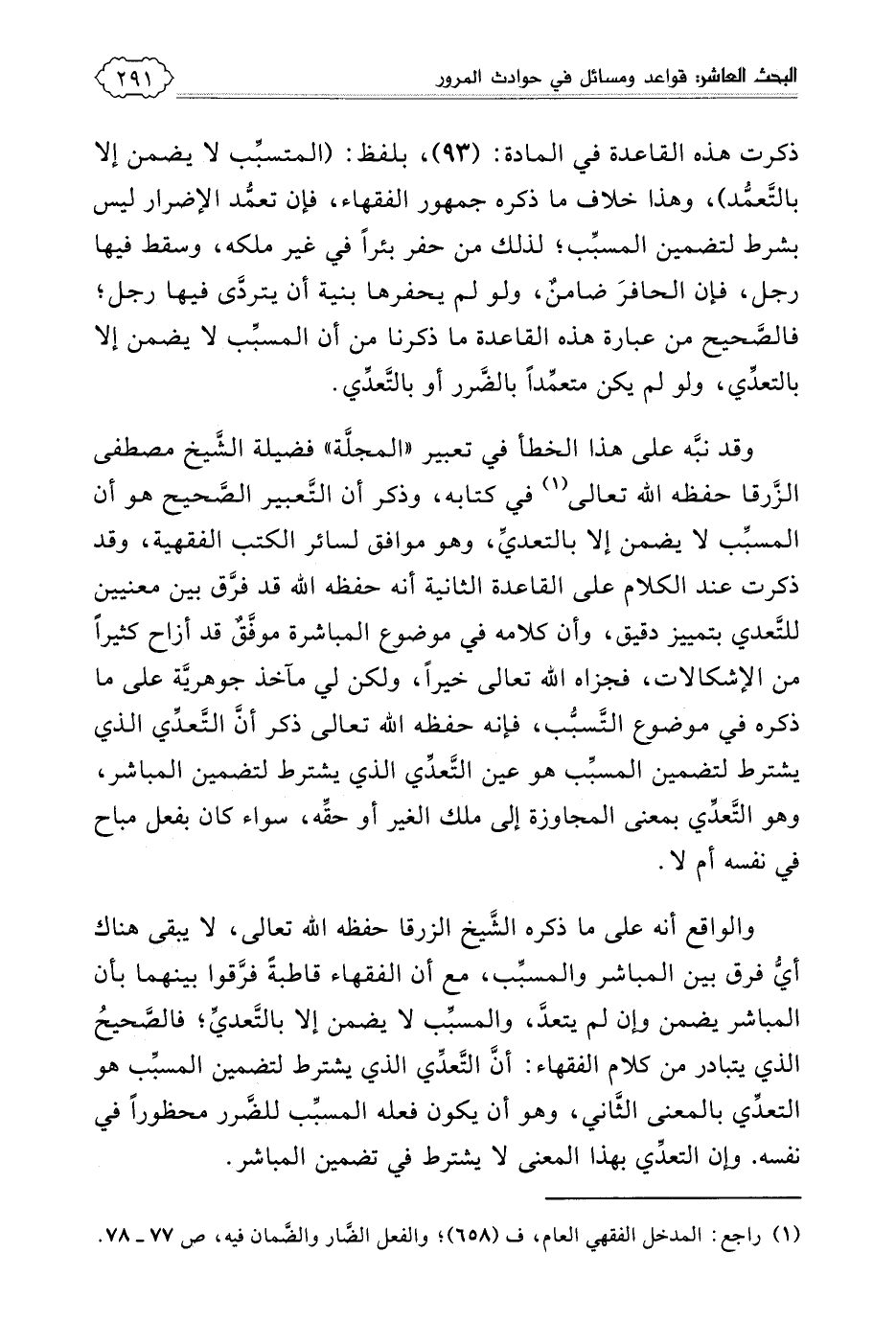 ولكن من الطبيعي أن العصر الذي دون فيه الفقهاء هذه المسائل لم يكن يعرف هذه المراكب السريعة من السيارات والقطر والطائرات وهذا النظام الجديد للمرور. ولذا فإنهم إنما تكلموا عن المراكب المعروفة في عهدهم من الدواب والعجلات والسفن ووسائل السير التي كانت تستخدم في البيئة التي يعيشون فيها. ولكن كلامهم المبني على مآخذ الشريعة الأصلية من القرآن والسنة والإجماع والقياس قد أوضح لنا أصولا عامة يمكن تطبيقها على كل ما وجد، أو سيوجد، من الوسائل الجديدة للسير. فمهمة الفقيه المعاصر اليوم هي أن يعرف هذه الأصول العامة ويطبقها على الحياة المعاصرة، مع الاعتناء بالفوارق في نظام السير الجديد التي تميزه عن النظام القديم، ويشرح جزيئاته على ذلك الأساس شرحا واضحا، ليتبين حكم كل جزئية من حوادث السير على حدة من غيرها.