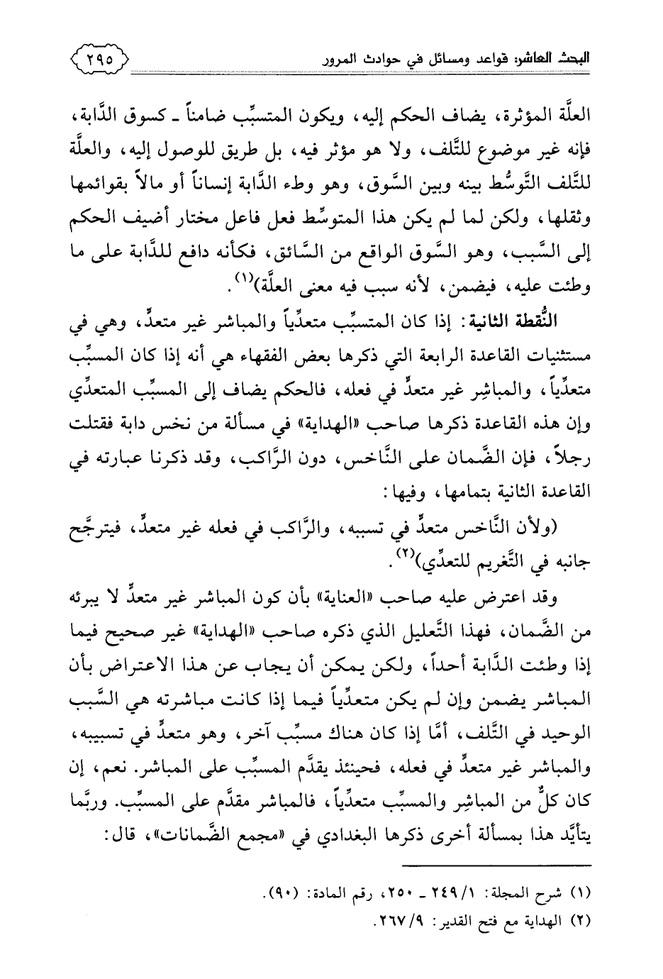 القاعد الثانية: المباشر ضامن، وإن لم يكن متعديا: وحاصل هذه القاعدة أن من باشر الإضرار بالغير، فهو ضامن للضرر الذي أصابه بالمضرور بفعله، وإن لم يكن المباشر متعديا، بمعني أنه لم يكن فعله محظورا في نفسه، وهذا كالنائم الذي انقلب على آخر فقتله، فإنه قد باشر القتل، مع أن نومه لم يكن محظورا في نفسه، ولذلك يضمن دية المقتول. وإن هذه القاعدة قد ذكرها الفقهاء بعبارات متقاربة، واتفقوا على مضمونها، وهي من أهم القواعد المتبعة في مسألة ضمان الضرر، ولكن ربما وقع هناك اشتباه في فهمها وخطأ في تطبيقها على بعض الجزئيات، فيجب أن تدرس القاعدة بدقة في مفهومها الصحيح.