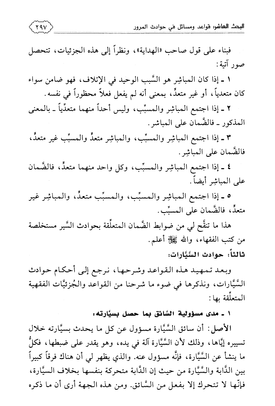 يرتفع التعارض بين من اشترط التعدي لضمان المباشر ومن لم يشترطه. والحاصل إذن: أن المباشر كلما أحدث ضررا في نفس معصوم، أو في بدنه أو في ماله فإنه ضامن، ولو صدر ذلك منه عند مباشرة فعل مباح في نفسه بدون تعمد.