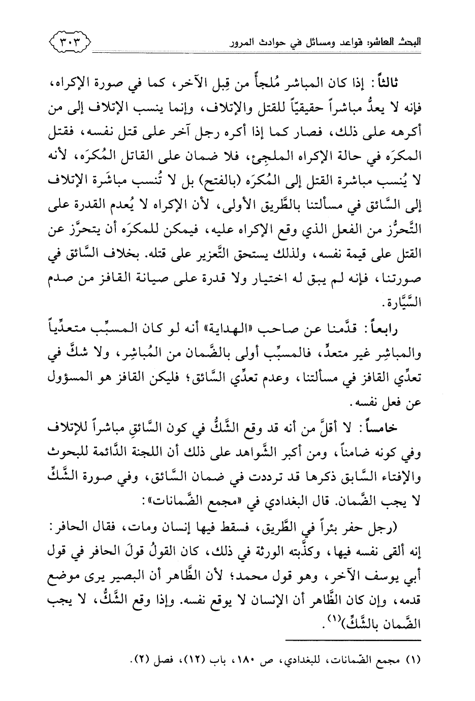 وإن هذه النصوص الفقهية تدل على مدى تعمق الفقهاء في التثبت من تحقق المباشرة، وإن هذه النقطة مهمة جدا، وسوف تفيد في عدة مسائل من حوادث السيارات وغيرها، كما سيأتي إن شاء الله تعالى.