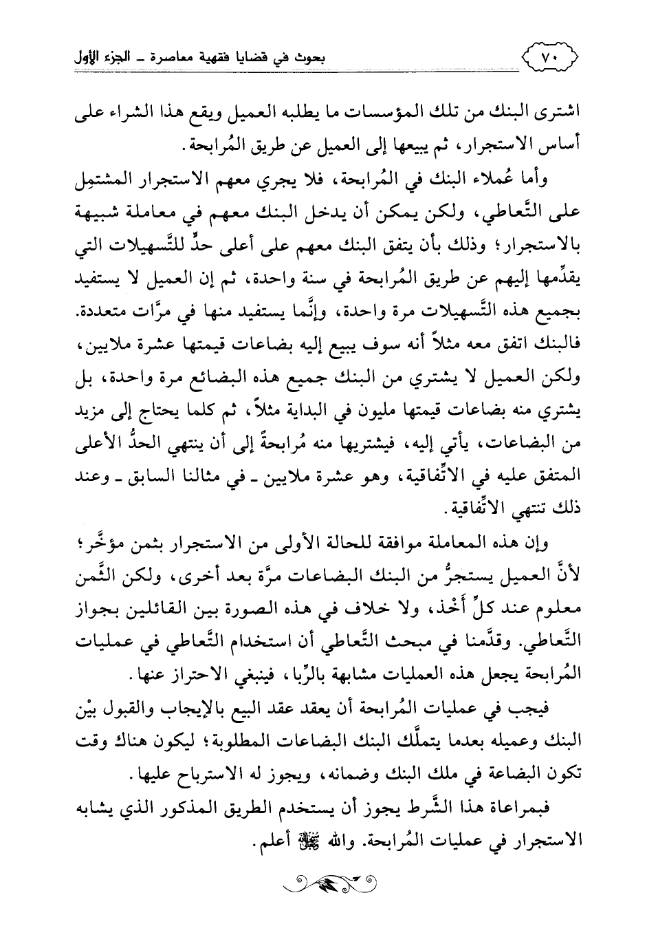 ولم أرَ أحداً من الذين تكلموا عن الاستجرار من تعرض لهذا الإشكال. والذي يظهر لي أنّ هذا المبلغ دفعة تحت الحساب، وهي، وإن كانت قرضاً في الاصطلاح الفقهيّ، من حيث إنّه يجوز للمدفوع له أن يصرفها في حوائج نفسه، ومن حيث كونها مضمونة عليه، ولكنها قرض يجوز فيه شرط البيع اللاحق، لكونه شرطاً متعارفاً، فإن الدفعات تحت الحساب لا يقصد بها الإقراض، وإنما يقصد بها تفريغ ذمة المشتري عن أداء الثمن عند البيع اللاحق وأن يتيسر له شراء الحاجات دون أن يتكلف نقد الثمن في كلّ مرّة. فهذا قرض تعورف فيه شرط البيع. والشرط كلما كان متعارفاً فإنه يجوز عند الحنفية، وإن كان مخالفاً لمقتضى العقد، كما في شراء النعل بشرط أن يحذوه البائع.
