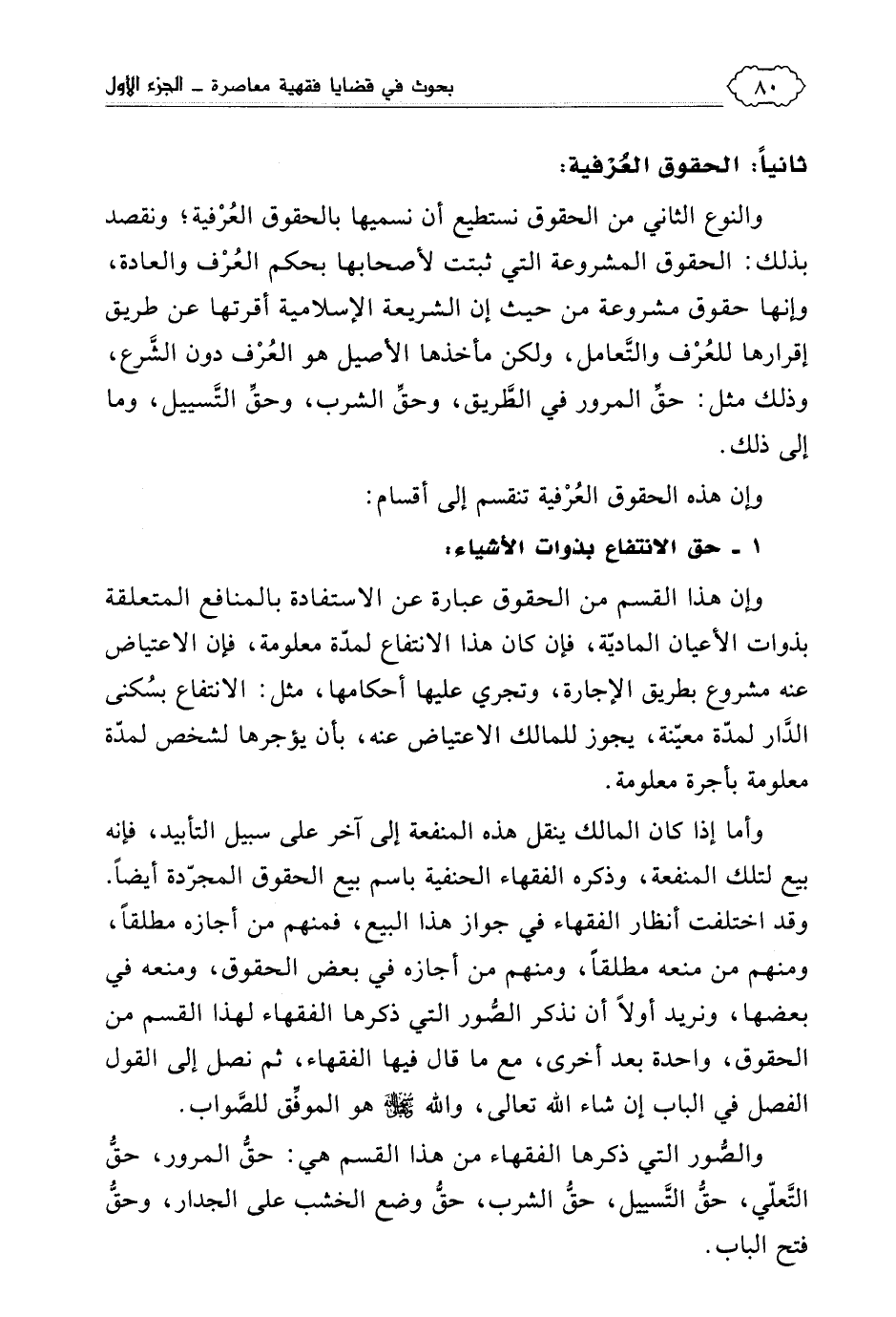 فنريد أولا أن مذكر هذه الأنواع من الحقوق التي ذكرها الفقهاء في كتبهم، ونتكلم على كل منها على حدة، بذكر ما قال فيه الفقهاء رحمهم الله تعالى، فنستخلص من كلامهم ما يدلنا على الحكم الشرعي في هذه الحقوق التي شاع تداولها بين الناس، والتي نريد أن نعرف حكم الاعتياض عنها والله سبحانه وتعالى هو الموفق والمعين.