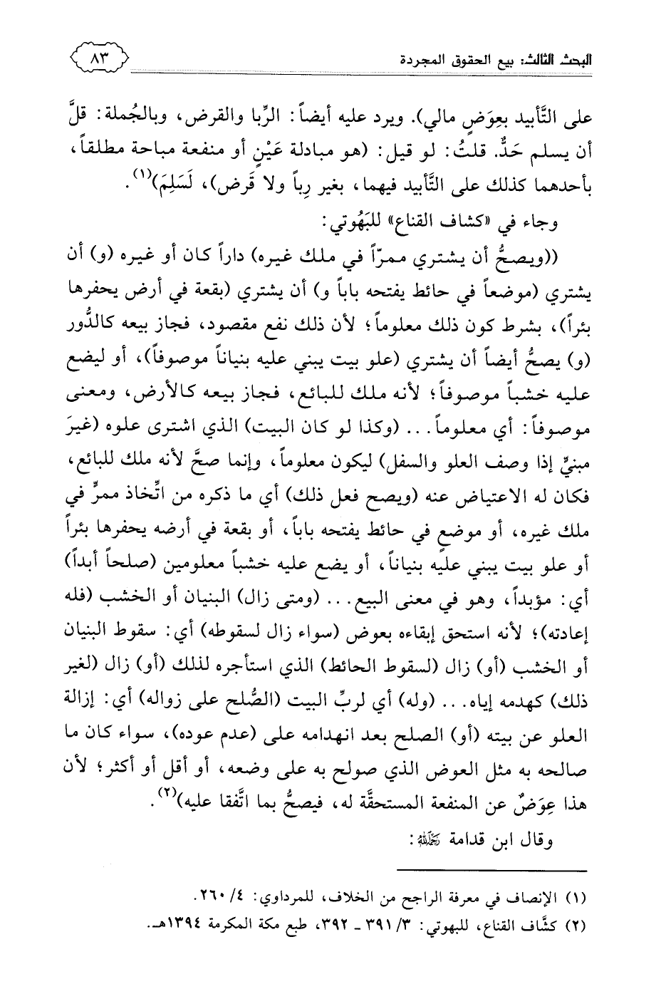 وكذلك الزوج له الحق في أن يتمتع بزوجته ببقاء نكاحها معه، ولكنه يمسك عن استعمال هذا الحق بمال تفتدي به المرأة، وهو الخلع والطلاق على مال، وذلك جائز بنص القرآن، وعلى ذلك انعقد الإجماع. وإن هذا الفرق بين الحقوق الضرورية والحقوق الأصلية قد ذكره البيري من الفقهاء الحنفية في شرحه على الأشباه والنظائر (1) وحكاه ابن عابدين رحمه الله ولخصه بقوله: (وحاصله أن ثبوت حق الشفعة للشفيع، وحق القسم للزوجة، وكذلك حق الخيار في النكاح للمخيرة إنما هو لدفع الضرر عن الشفيع والمرأة، وما ثبت لذلك لا يصح الصلح عنه، لأن صاحب الحق لما رضي علم أنه لا يتضرر بذلك، فلا يستحق شيئا. أما حق الموصى له بالخدمة، فليس كذلك، بل ثبت له على وجه البر والصلة، فيكون ثابتا له أصالة، فيصح الصلح عنه إذا نزل عنه لغيره، ومثله ما مر عن الأشباه من حق القصاص والنكاح والرق، حيث صح الاعتياض عنه، لأنه ثابت لصاحبه أصالة، لا على وجه دفع الضرر عن صاحبه) (2) .