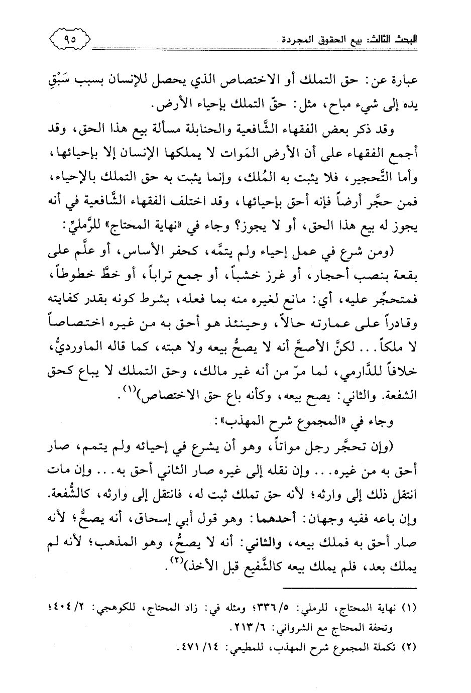 ثم ذكر أن الفقيه أبا الليث صحح رواية الزيادات، وهي عدم الجواز لأن بيع الحقوق المجردة لا يجوز. لكن ذكر في الدر المختار أن رواية الجواز أخذ بها عامة المشايخ. وقال ابن عابدين تحته: " قوله: وبه أخذ عامة المشايخ "، قال السائحاني: " وهو الصحيح وعليه الفتوى، (مضمرات) . والفرق بينه وبين حق التعلي حيث لا يجوز، هو أن حق المرور حق يتعلق