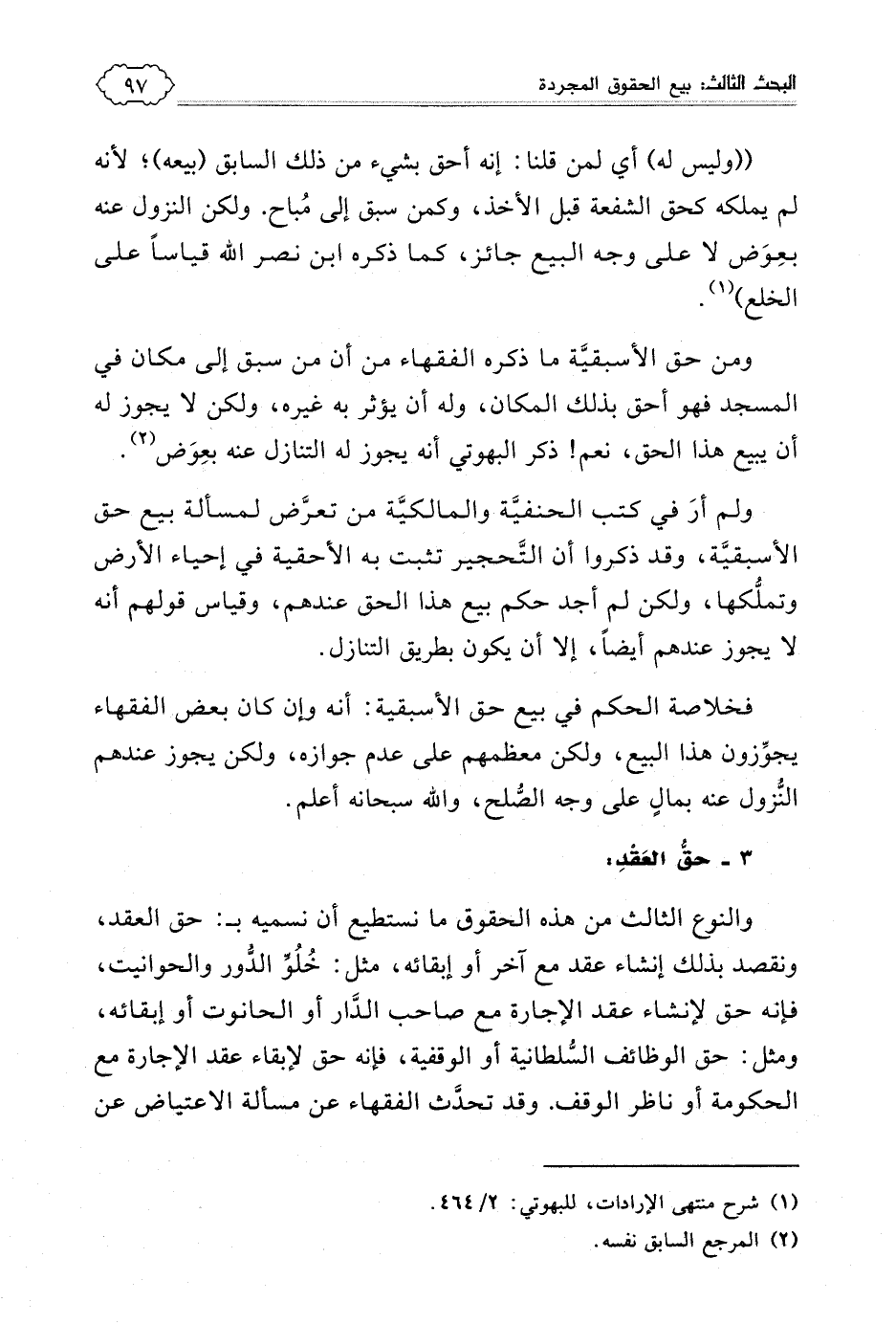 ظاهر في ديارنا بنسف، فإنهم يبيعون الماء " فللعرف الظاهر كان يفتي بجوازه، ولكن العرف إنما يعتبر فيما لا نص بخلافه، والنهي عن بيع الغرر نص بخلاف هذا العرف، فلا يعتبر) (1) . فعلل السرخسي رحمه الله عدم الجواز بأمرين: أنه من حقوق المبيع، فلا يفرد بالبيع، والثاني: أن فيه غررا وجهالة. ولما استدل المجوزون بالعرف الظاهر عارضه بالأمر الثاني فحسب، وذكر أن العرف لا يصلح أن يجوز به الغرر المنهي عنه بالنص، ولم يقل إن العرف لا يصلح أن يجوز به بيع الحقوق. وقد صرح بذلك ابن همام رحمه الله حيث قال: " ثم بتقدير أنه حظ من الماء فهو مجهول المقدار، فلا يجوز بيعه، وهذا وجه منع مشايخ بخارى بيعه مفردا " (2) .