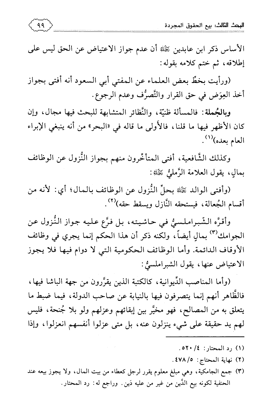 خلاصة حكم هذا النوع من الحقوق: ومن المناسب قبل أن نتقدم أن نحرر ما تحصل مما سبق من النصوص الفقهية، وهي أمور: