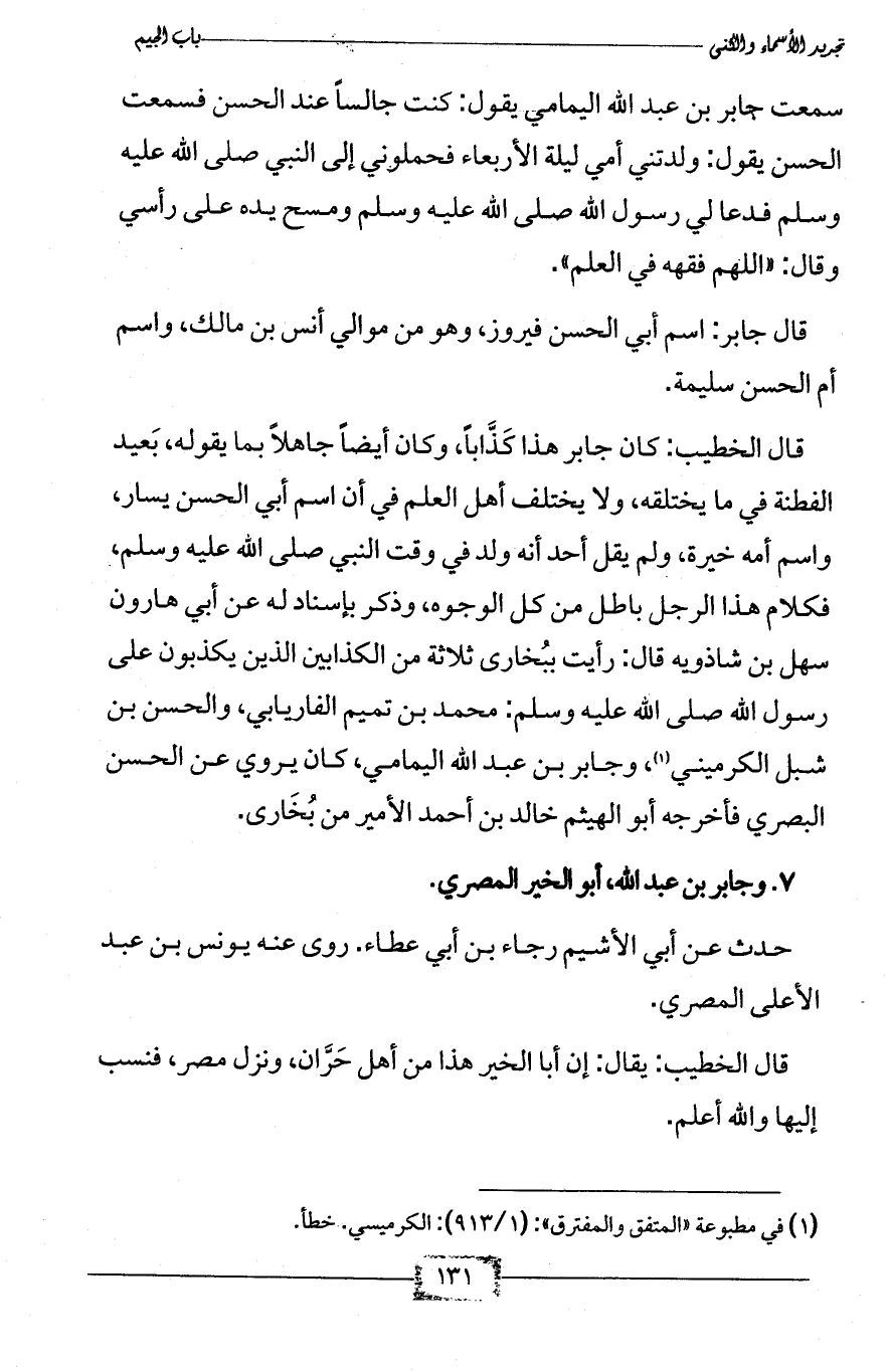 قال الخطيب: كان جابر هذا كَذَّاباً، وكان أيضاً جاهلاً بما يقوله، بَعيد الفطنة في ما يختلقه، ولا يختلف أهل العلم في أن اسم أبي الحسن يسار، واسم أمه خيرة، ولم يقل أحد أنه ولد في وقت النبي صلى الله عليه وسلم، فكلام هذا الرجل باطل من كل الوجوه، وذكر بإسناد له عن أبي هارون سهل بن شاذويه قال: رأيت ببُخارى ثلاثة من الكذابين الذين يكذبون على رسول الله صلى الله عليه وسلم: محمد بن تميم الفاريابي، والحسن بن شبل الكرميني (¬1)، وجابر بن عبد الله اليمامي، كان يروي عن الحسن البصري فأخرجه أبو الهيثم خالد بن أحمد الأمير من بُخَارى.