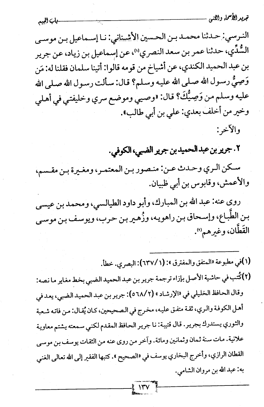 (¬2) كُتب في حاشية الأصل بإزاء ترجمة جرير بن عبد الحميد الضبي بخط مغاير ما نصه: وقال الحافظ الخليلي في «الإرشاد» (2/ 568): جرير بن عبد الحميد الضبي، يعد في أهل الكوفة والري، ثقة متفق عليه، مخرج في الصحيحين، كان يُقال: من فاته شعبة والثوري يستدرك بجرير. قال قتيبة: نا جرير الحافظ المقدم لكني سمعته يشتم معاوية علانية. مات سنة ثمان وثمانين ومائة. وآخر من روى عنه من الثقات يوسف بن موسى القطان الرازي، وأخرج البخاري يوسف في «الصحيح». كتبها الفقير إلى الله تعالى الغني به: عبد الله بن مروان الشامي.