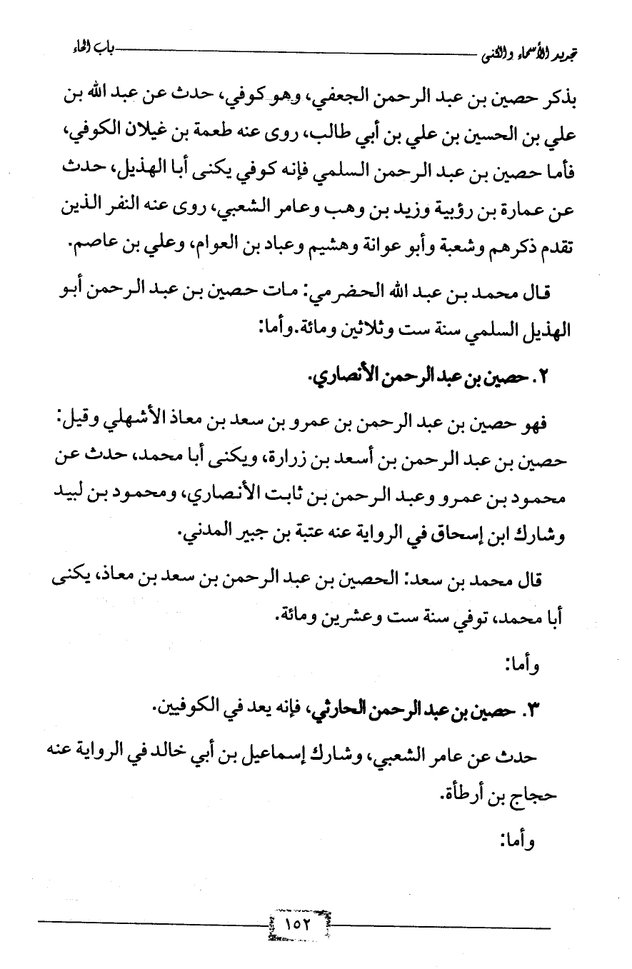 بذكر حصين بن عبد الرحمن الجعفي، وهو كوفي، حدث عن عبد الله بن علي بن الحسين بن علي بن أبي طالب، روى عنه طعمة بن غيلان الكوفي، فأما حصين بن عبد الرحمن السلمي فإنه كوفي يكنى أبا الهذيل، حدث عن عمارة بن رؤبية وزيد بن وهب وعامر الشعبي، روى عنه النفر الذين تقدم ذكرهم وشعبة وأبو عوانة وهشيم وعباد بن العوام، وعلي بن عاصم.