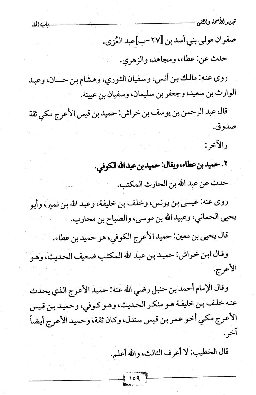وقال ابن خراش: حميد بن عبد الله المكتب ضعيف الحديث، وهو الأعرج.