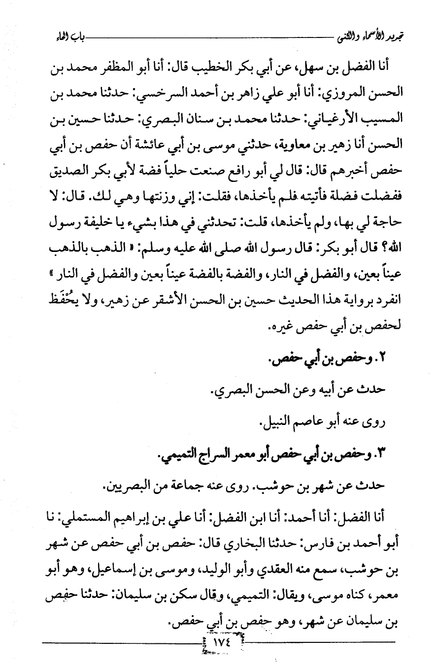 أنا الفضل بن سهل، عن أبي بكر الخطيب قال: أنا أبو المظفر محمد بن الحسن المروزي: أنا أبو علي زاهر بن أحمد السرخسي: حدثنا محمد بن المسيب الأرغياني: حدثنا محمد بن سنان البصري: حدثنا حسين بن الحسن أنا زهير بن معاوية، حدثني موسى بن أبي عائشة أن حفص بن أبي حفص أخبرهم قال: قال لي أبو رافع صنعت حلياً فضة لأبي بكر الصديق ففضلت فضلة فأتيته فلم يأخذها، فقلت: إني وزنتها وهي لك. قال: لا حاجة لي بها، ولم يأخذها، قلت: تحدثني في هذا بشيء يا خليفة رسول الله؟ قال أبو بكر: قال رسول الله صلى الله عليه وسلم: «الذهب بالذهب عيناً بعين، والفضل في النار، والفضة بالفضة عيناً بعين والفضل في النار» انفرد برواية هذا الحديث حسين بن الحسن الأشقر عن زهير، ولا يُحْفَظ لحفص بن أبي حفص غيره.