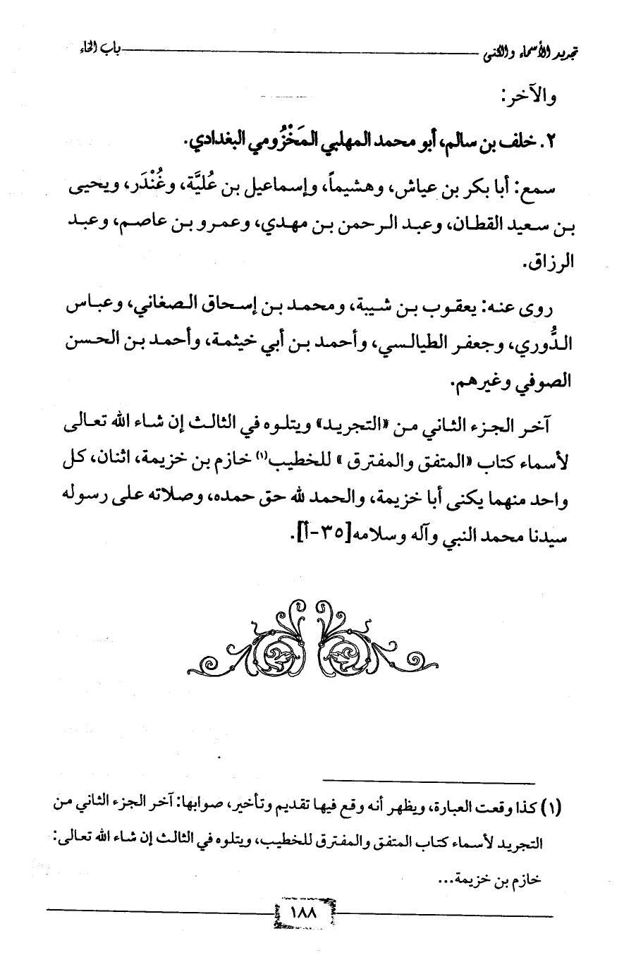 (¬1) كذا وقعت العبارة، ويظهر أنه وقع فيها تقديم وتأخير، صوابها: آخر الجزء الثاني من التجريد لأسماء كتاب المتفق والمفترق للخطيب، ويتلوه في الثالث إن شاء الله تعالى: خازم بن خزيمة ...