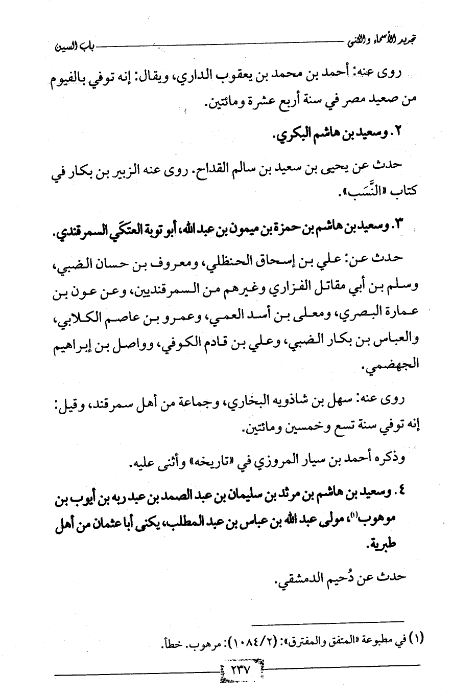 4 - وسعيد بن هاشم بن مرثد بن سليمان بن عبد الصمد بن عبد ربه بن أيوب بن موهوب (¬1)، مولى عبد الله بن عباس بن عبد المطلب، يكنى أبا عثمان من أهل طبرية.