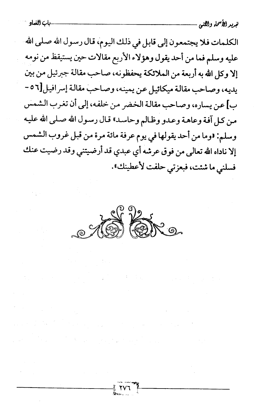 الكلمات فلا يجتمعون إلى قابل في ذلك اليوم، قال رسول الله صلى الله عليه وسلم فما من أحد يقول وهؤلاء الأربع مقالات حين يستيقظ من نومه إلا وكل الله به أربعة من الملائكة يحفظونه، صاحب مقالة جبرئيل من بين يديه، وصاحب مقالة ميكائيل عن يمينه، وصاحب مقالة إسرافيل [56 - ب] عن يساره، وصاحب مقالة الخضر من خلفه، إلى أن تغرب الشمس من كل آفة وعاهة وعدو وظالم وحاسد» قال رسول الله صلى الله عليه وسلم: «وما من أحد يقولها في يوم عرفة مائة مرة من قبل غروب الشمس إلا ناداه الله تعالى من فوق عرشه أي عبدي قد أرضيتني وقد رضيت عنك فسلني ما شئت، فبعزتي حلفت لأعطينك».