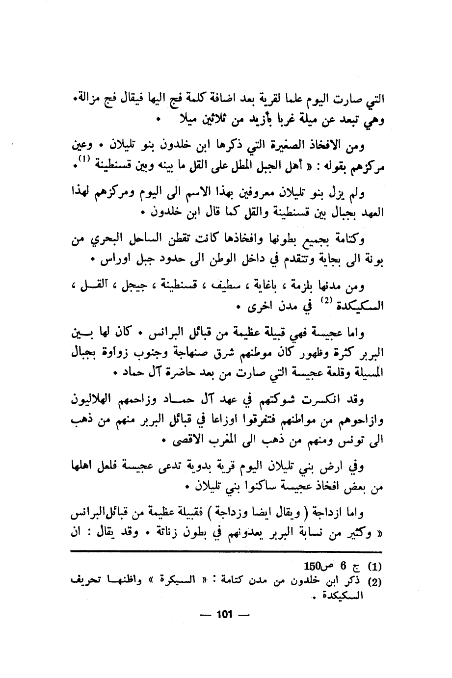 ولم يزل بنو تليلان معروفين بهذا الاسم الى اليوم ومركزهم لهذا العهد بجبال بين قسنطينة والقل كما قال ابن خلدون.