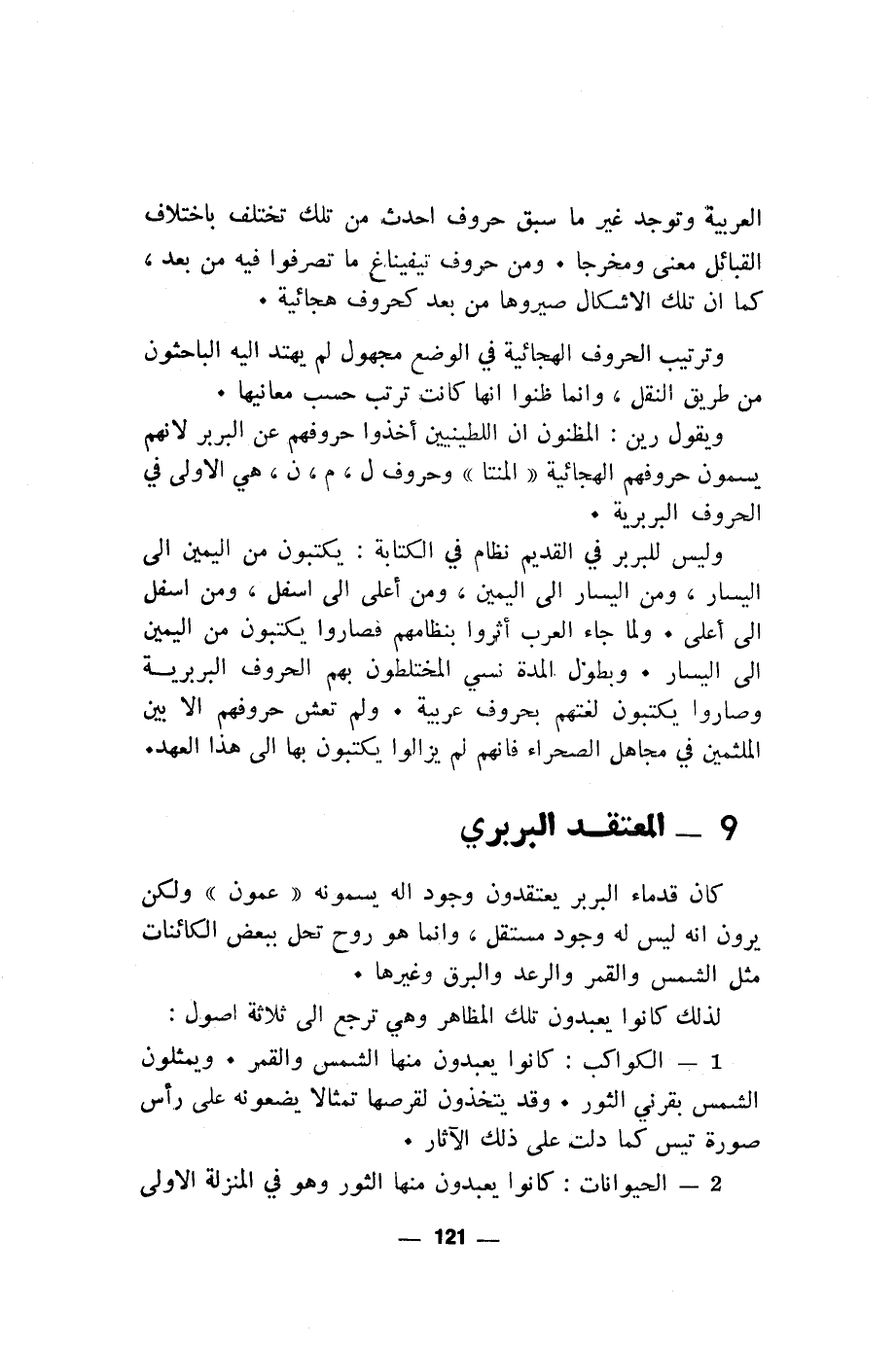 وليس للبربر في القديم نظام في الكتابة: يكتبون من اليمين الى اليسار، ومن اليسار الى اليمين، ومن أعلى الى اسفل، ومن اسفل الى أعلى. ولما جاء العرب أثروا بنظامهم وصاروا يكتبون من اليمين الى اليسار. وبطول المدة نسي المختلطون بهم الحروف البربرية وصاروا يكتبون لغتهم بحروف عربية. ولم تعش حروفهم الا بين الملثمين في مجاهل الصحراء فانهم لم يزالوا يكتبون بها الى هذا العهد.