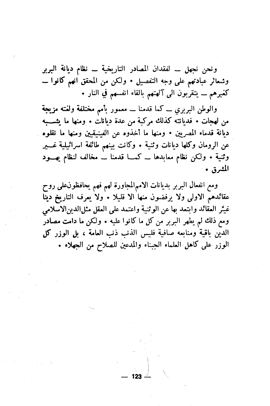 ومع انفعال البربر بديانات الامم المجاورة لهم فهم يحافظون على روح عقائدهم الاولى ولا يرفضون منها الا قليلا. ولا يعرف التاريخ دينا غيَّر العقائد وابتعد بها عن الوثنية واعتمد على العقل مثل الدين الاسلامي ومع ذلك لم يطهر البربر من كل ما كانوا عليه. ولكن ما دامت مصادر الدين باقية ومنابعه صافية فليس الذنب ذنب العامة، بل الوزر كل الوزر على كاهل العلماء الجبناء والمدعين للصلاح من الجهلاء.