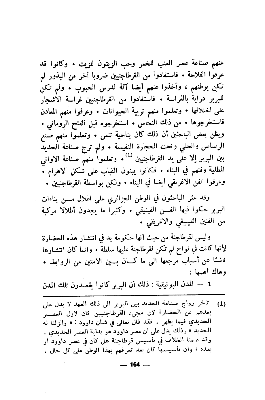 (¬1) تأخر رواج صناعة الحديد بين البربر الى ذلك العهد لا يدل على بعدهم عن الحضارة لأن مجيئ القرطاجنيين كان لاول العصر الحديدي فيما يظهر. فقد قال تعالى في شأن داوود: {وَأَلَنَّا لَهُ الْحَدِيدَ} وذلك بدل على أن عصر داوود هو بداية العصر الحديدي. وقد علمنا الخلاف في تأسيس قرطاجنة هل كان في عصر داوود او بعده، وان تأسيسها كان بعد تعرفهم بهذا الوطن على كل حال.