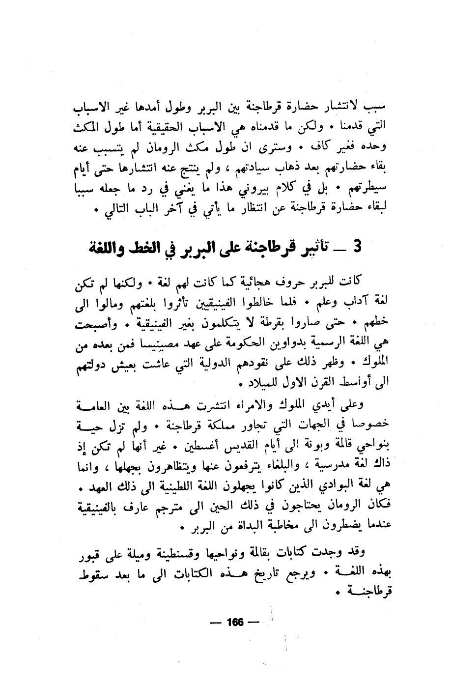 سبب لانتشار حضارة قرطاجنة بين البربر وطول أمدها غير الاسباب التي قدمنا. ولكن ما قدمناه هي الاسباب الحقيقية أما طول المكث وحده فغير كاف. وسنرى ان طول مكث الرومان لم يتسبب عنه بقاء حضارتهم بعد ذهاب سيادتهم، ولم ينتج عنه انتشارها حتى أيام سيطرتهم. بل في كلام بيروني هذا ما يغني في رد ما جعله سببا لبقاء حضارة قرطاجنة عن انتظار ما يأتي في آخر الباب التالي.