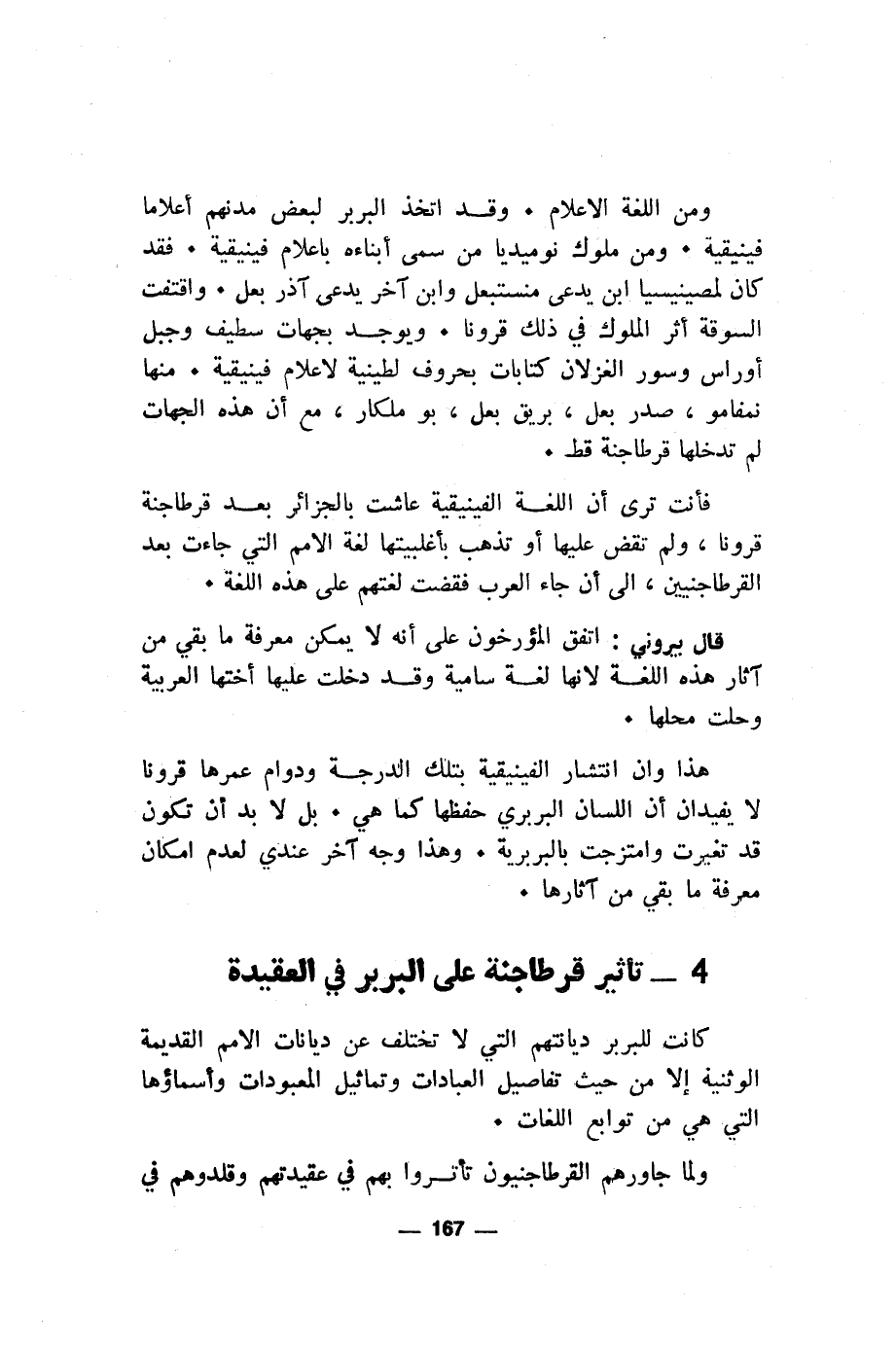 هذا وان انتشار الفينيقية بتلك الدرجة ودوام عمرها قرونا لا يفيدان أن اللسان البربري حفظها كما هي. بل لا بد أن تكون قد تغيرت وامتزجت بالبربرية. وهذا وجه آخر عندي لعدم امكان معرفة ما بقي من آثارها.