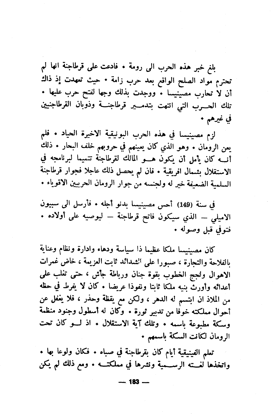 لزم مصينيسا في هذه الحرب البونيقية الاخيرة الحياد. فلم يعن الرومان. وهو الذي كان يعينهم في حروبهم خلف البحار. ذلك أنه كان يأمل أن يكون هو المالك لقرطاجنة تتميما لبرنامجه في الاستقلال بشمال أفريقية. فان لم يحصل ذلك عاجلا فجوار قرطاجنة السلمية الضعيفة خير له ولجنسه من جوار الرومان الحربيين الاقوياء.