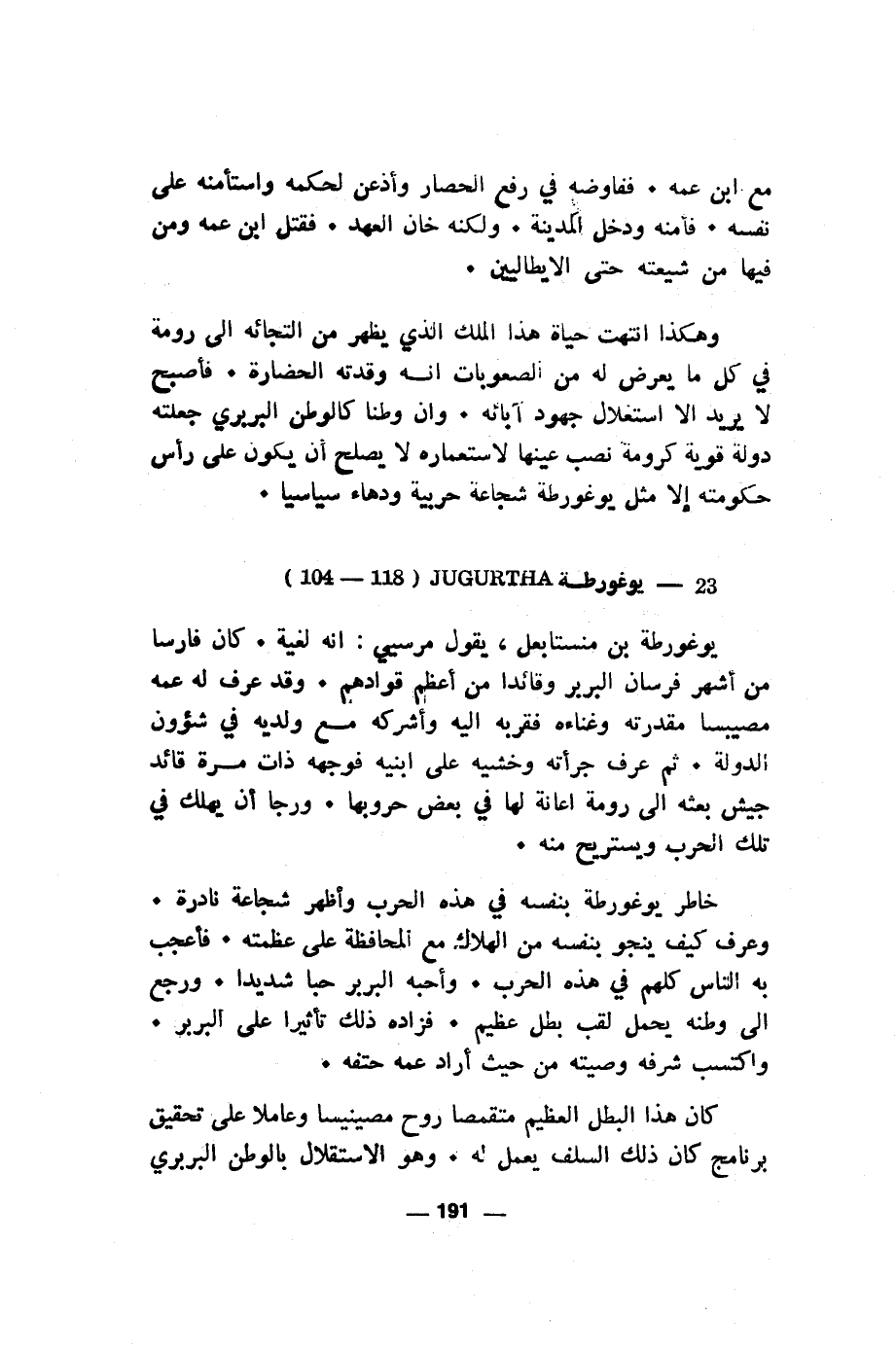 وهكذا انتهت حياة هذا الملك الذي يظهر من التجائه الى رومة في كل ما يعرض له من الصعوبات انه وقدته الحضارة. فاصبح لا يريد الا استغلال جهود آبائه. وان وطنا كالوطن البريري جعلته دولة قوية كرومة نصب عينها لاستعماره لا يصلح أن يكون على رأس حكومته إلا مثل يوغورطة شجاعة حربية ودهاء سياسيا.