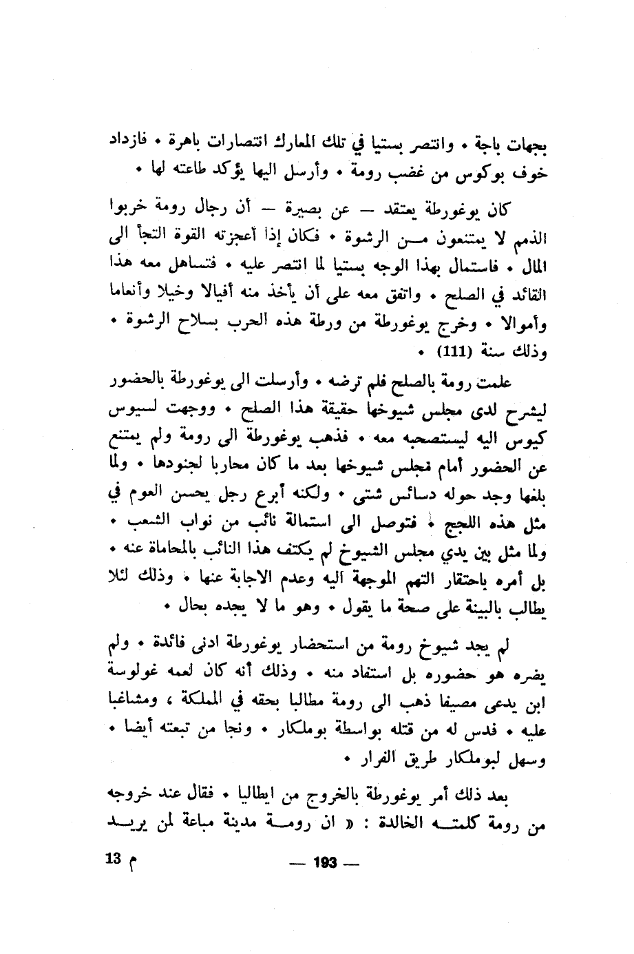 كان يوغورطة يعتقد- عن بصيرة- أن رجال رومة خربوا الذمم لا يمتنعون من الرشوة. فكان إذا أعجزته القوة التجأ إلى المال. فاستمال بهذا الوجه بستيا لما انتصر عليه. فتساهل معه هذا القائد في الصلح. واتفق معه على أن يأخذ منه أفيالا وخيلا وأنعاما وأموالا. وخرج يوغورطة من ورطة هذه الحرب بسلاح الرشوة. وذلك سنة (111).