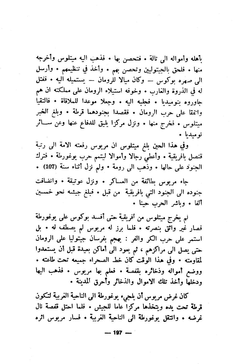 بأهله وأمواله إلى تالة. فتصحن بها. فذهب اليه ميتلوس وأخرجه منها. فلحق بالجيتوليين: وتحصن بهم. وأخذ قي تنظيمهم. وأرسل الى صهره بوكوس - وكان ميالا للرومان- يستميله اليه. ففتل له في الذروة والغارب. وخوفه استيلاء الرومان على مملكته ان هم جاوروه بنوميديا. فجلبه اليه. وجعلا موعدا للملاقاة. فالتقيا واتفقا على حرب الرومان. فقصدا بجنودهما قرطة. وبلغ الخبر ميتلوس. فخرج منها. ونزل مركزا يليق للدفاع عنها وعن سائر نوميديا.