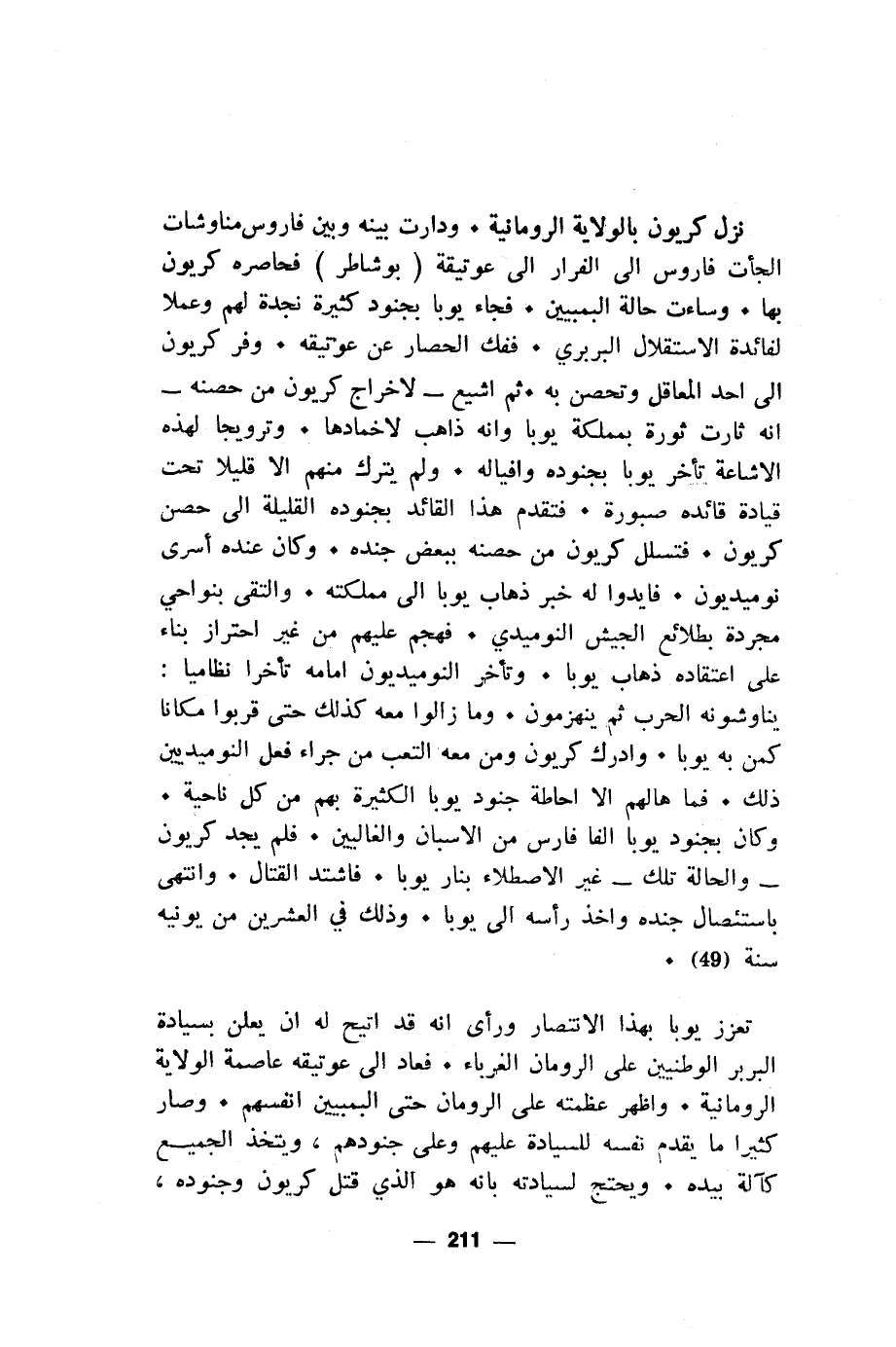 نزل كريون بالولاية الرومانية. ودارت بينه وبين فاروس مناوشات الجأت فاروس الى الفرار الى عوتيقة (بوشاطر) فحاصره كريون بها. وساءت حالة البمبيين. فجاء يوبا بجنود كثيرة نجدة لهم وعملا لفائدة الاستقلال البربري. ففك الحصار عن عوتيقه. وفر كريون الى احد المعاقل وتحصن به. ثم اشيع- لاخراج كريون من حصنه- انه ثارت ثورة بمملكة يوبا وانه ذاهب لاخمادها. وترويجا لهذه الاشاعة تأخر يوبا بجنوده وافياله. ولم يترك منهم الا قليلا تحت قيادة قائده صبورة. فتقدم هذا القائد بجنوده القليلة الى حصن كريون. فتسلل كريون من حصنه ببعض جنده. وكان عنده أسرى نوميديون. فايدوا له خبر ذهاب يوبا الى مملكته. والقى بنواحي مجردة بطلائع الجيش النوميدي. فهجم عليهم من غير احتراز بناء ظى اعتقاده ذهاب يوبا. وتأخر النوميديون امامه تأخرا نظاميا: يناوشونه الحرب ثم ينهزمون. وما زالوا معه كذلك حتى قربوا مكانا كمن به يوبا. وادرك كريون ومن معه التعب من جراء فعل النوميديين ذاك. فما هالهم الا احاطة جنود يوبا الكثيرة بهم من كل ناحية. وكان بجنود يوبا الفا فارس من الاسبان والغاليين. فلم يجد كريون - والحالة تلك- غير الاصطلاء بنار يوبا. فاشتد القتال. وانتهى باستئصال جنده واخذ رأسه الى يوبا. وذلك في العشرين من يونيه سنة (49).