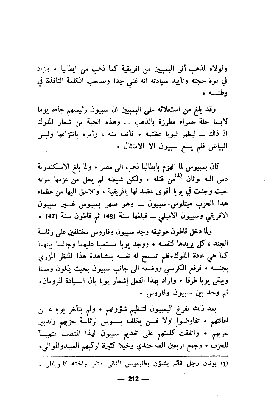 كان بمبيوس لما انهزم بايطاليا ذهب الى مصر. ولما بلغ الاسكندرية دس اليه بوثان (¬1) من قتله. ولكن شيعته لم يحل من عزمها موته حيث وجدت في يوبا أقوى عضد لها بأفريقية. وتلاحق اليها من عظماء هذا الحزب ميتلوس. سبيون- وهو صهر بمبيوس غير سبيون الأفريقي وسبيون الاميلي- فبلغها سنة (48) ثم قاطون سنة (47).
