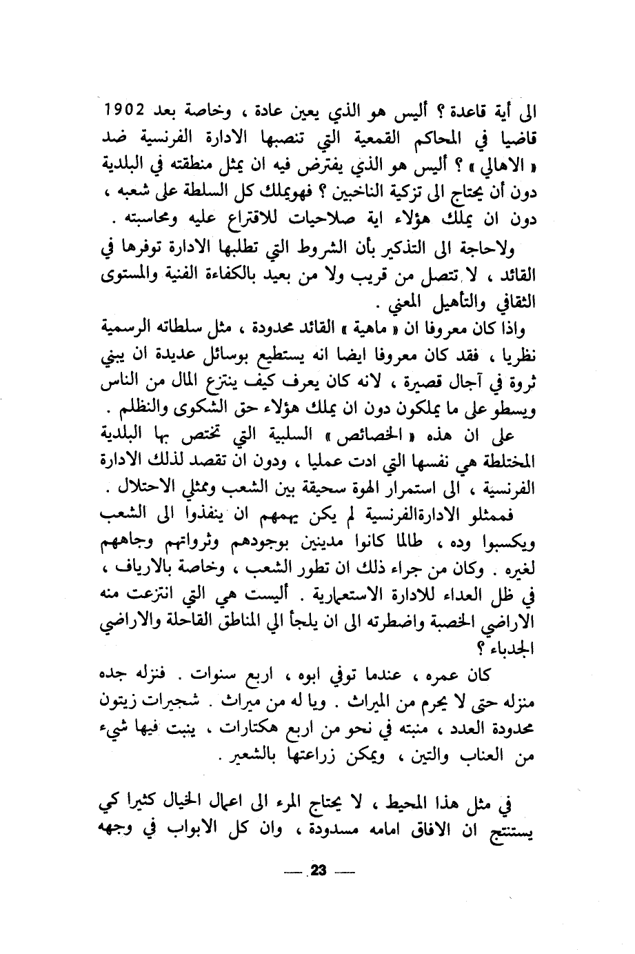 فممثلو الادارة الفرنسية لم يكن يهمهم ان ينفذوا الى الشعب ويكسبوا وده، طالما كانوا مدينين بوجودهم وثرواتهم وجاههم لغيره. وكان من جراء ذلك ان تطور الشعب، وخاصة بالارياف، في ظل العداء للادارة الاستعمارية. أليست هي التي انتزعت منه الاراضي الخصبة واضطرته الى ان يلجأ الي المناطق القاحلة والاراضي الجدباء؟