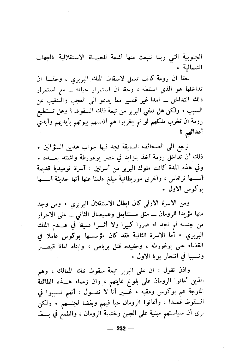 واذن نقول: ان على البربر تبعة سقوط تلك الممالك، وهم الذين أعانوا الرومان على بلوغ غايتهم، وان زعماء هذه الطائفة المارجة هم بوكوس وعقبه. غير أنا لا نقول: أنهم تسببوا في السقوط قصدا، وأعانوا الرومان حبا فيهم وبغضا لجنسهم. ولكن نرى أن سياستهم مبنية على الجبن وخشية الرومان، والطمع في بسط