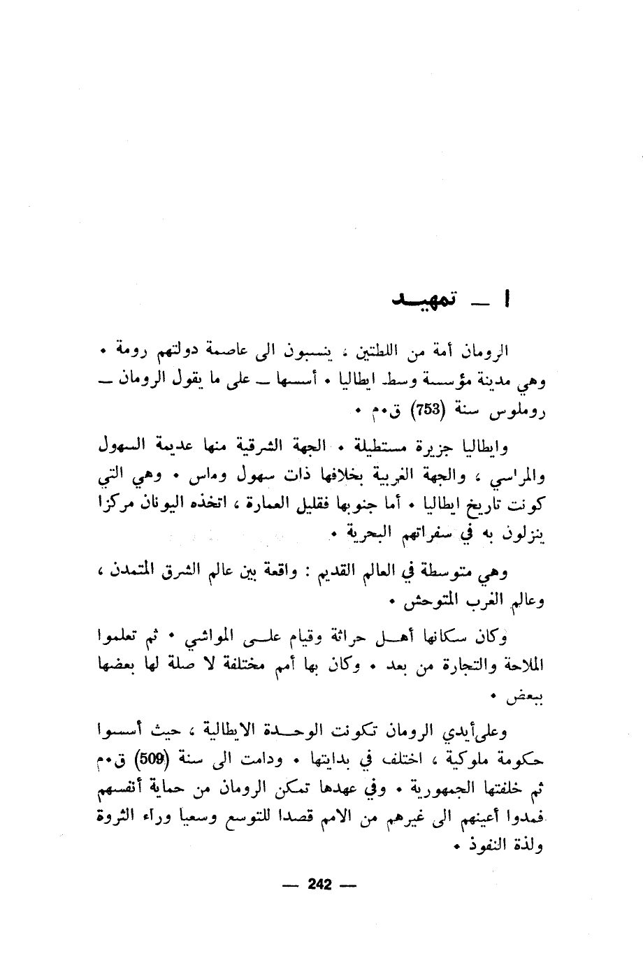 الرومان أمة من اللطتين، ينسبون الى عاصمة دولتهم رومة. وهي مدينة مؤسسة وسط ايطاليا. أسسها- على ما يقول الرومان- روملوس سنة (753) ق. م.